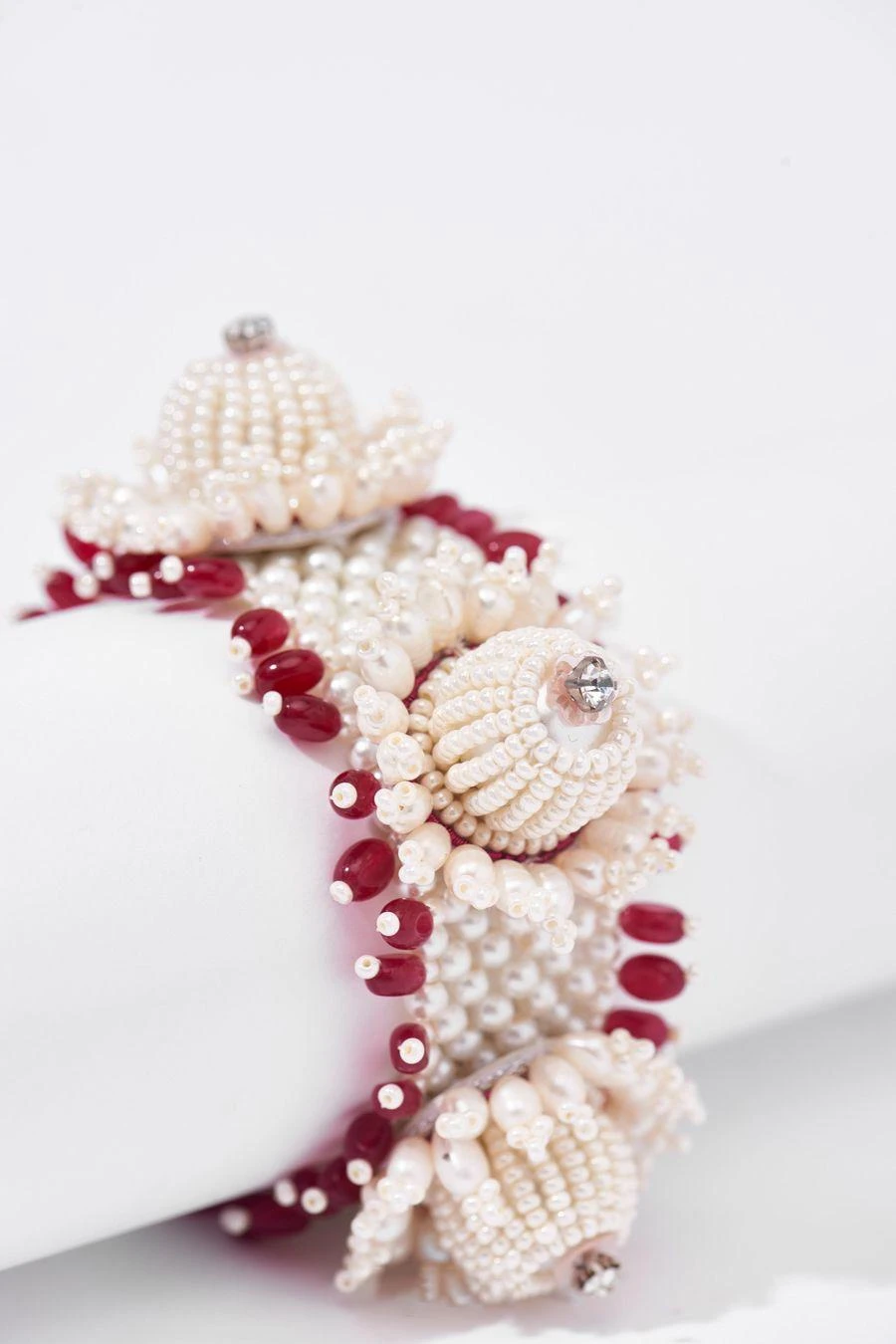 The oregon lily bracelet features a mix of pearls & semi-precious stones interpolated into soberly crafted design that exuberates a majestic aura. Hand embroidered to perfection, this piece has a hint of freshness while maintaining its regality.