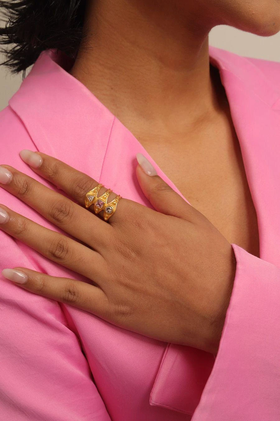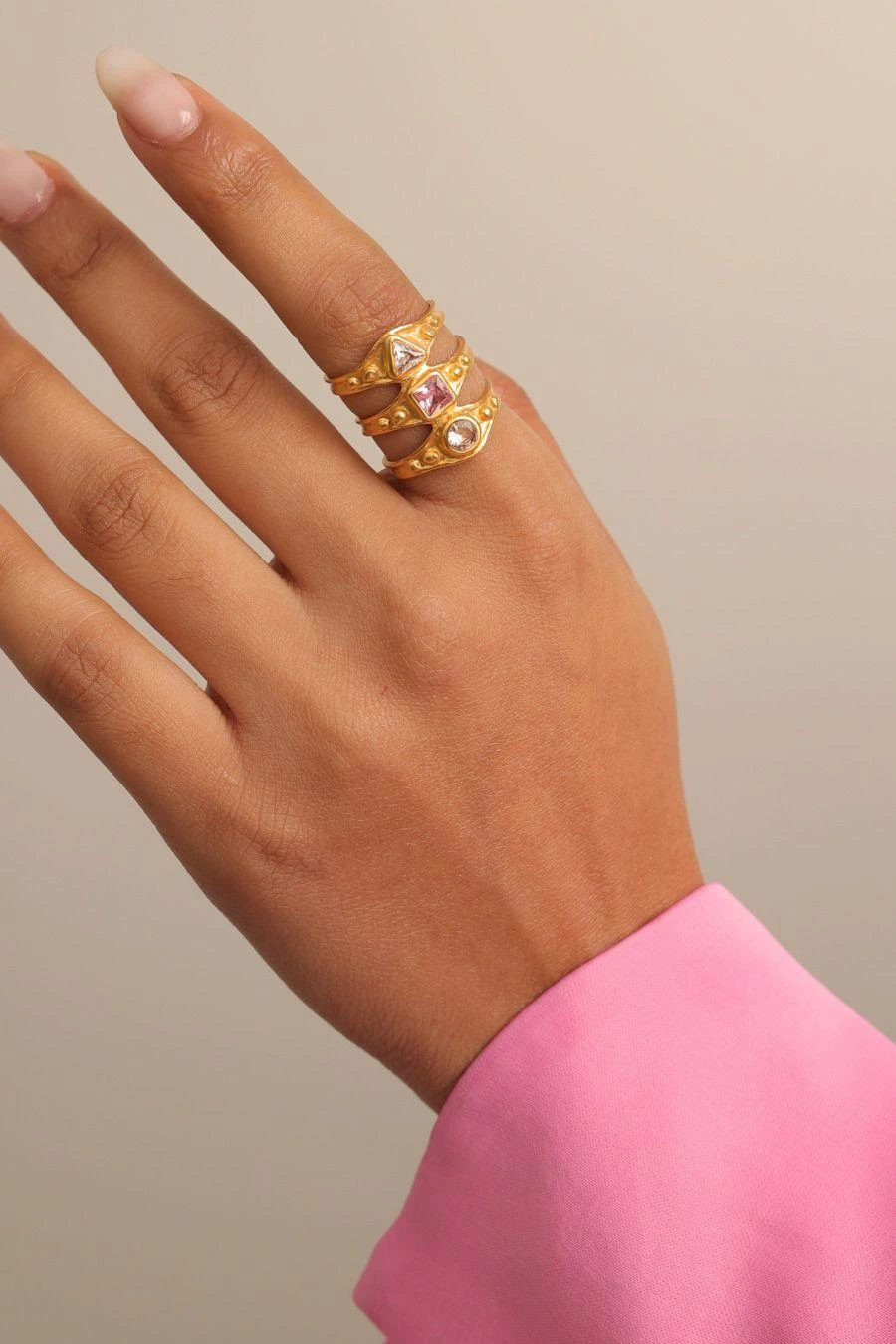 Embark on a journey of elegance with the Tres chic ring, a harmonious medley of brilliant trillion, round, & square stones. This masterpiece effortlessly transitions between formal & semi-formal occasions, radiating sophistication with every gesture.