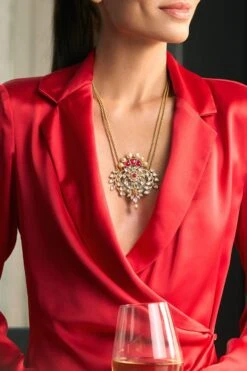 Beautifully crafted with a blend of elegance and boldness, this necklace is a stunning piece of art. It features consciously made stones including Iceberg, Morning Star, Lush Crimson, and Pastel Plum, which add depth and charm to any outfit.