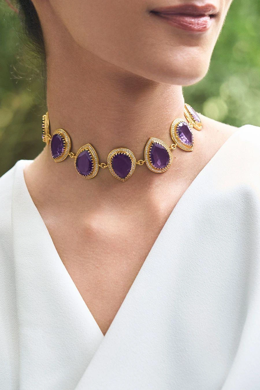 Indulge in luxury with this stunning choker adorned with delicately carved Lavender Dust stones and sparkling Morning Star stones. Made with recycled brass, it’s an ethical and sustainable choice for the fashion-conscious.