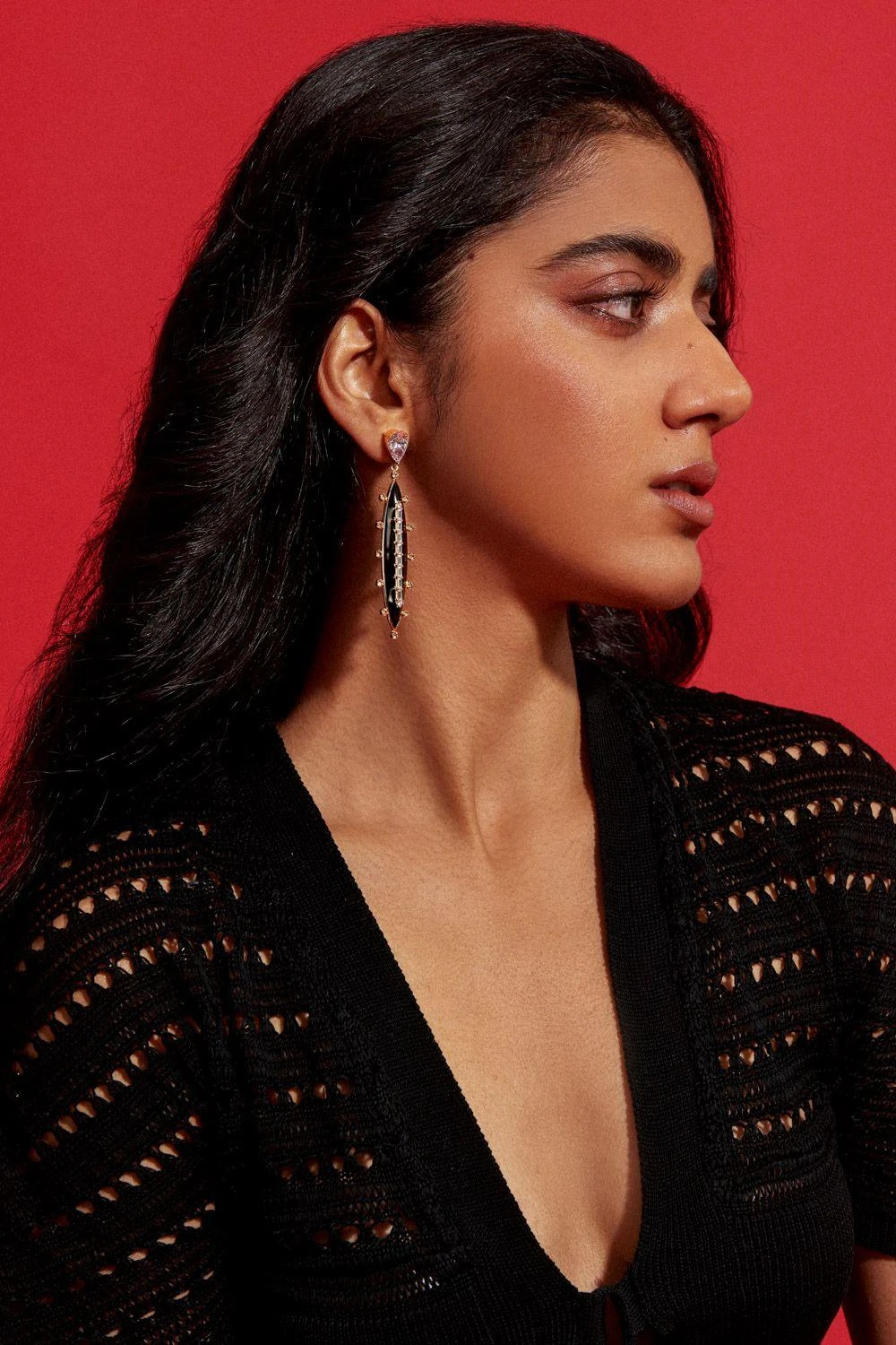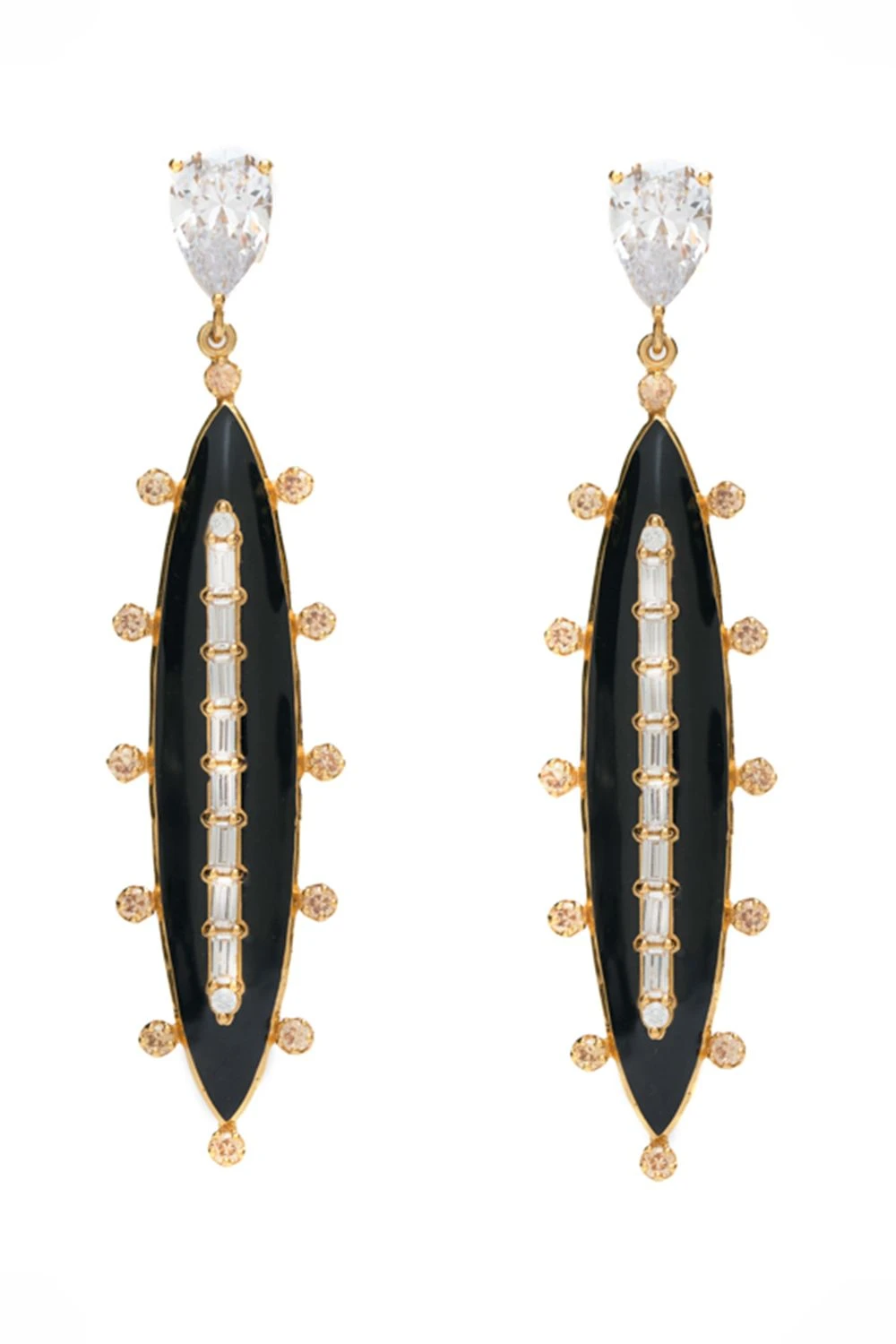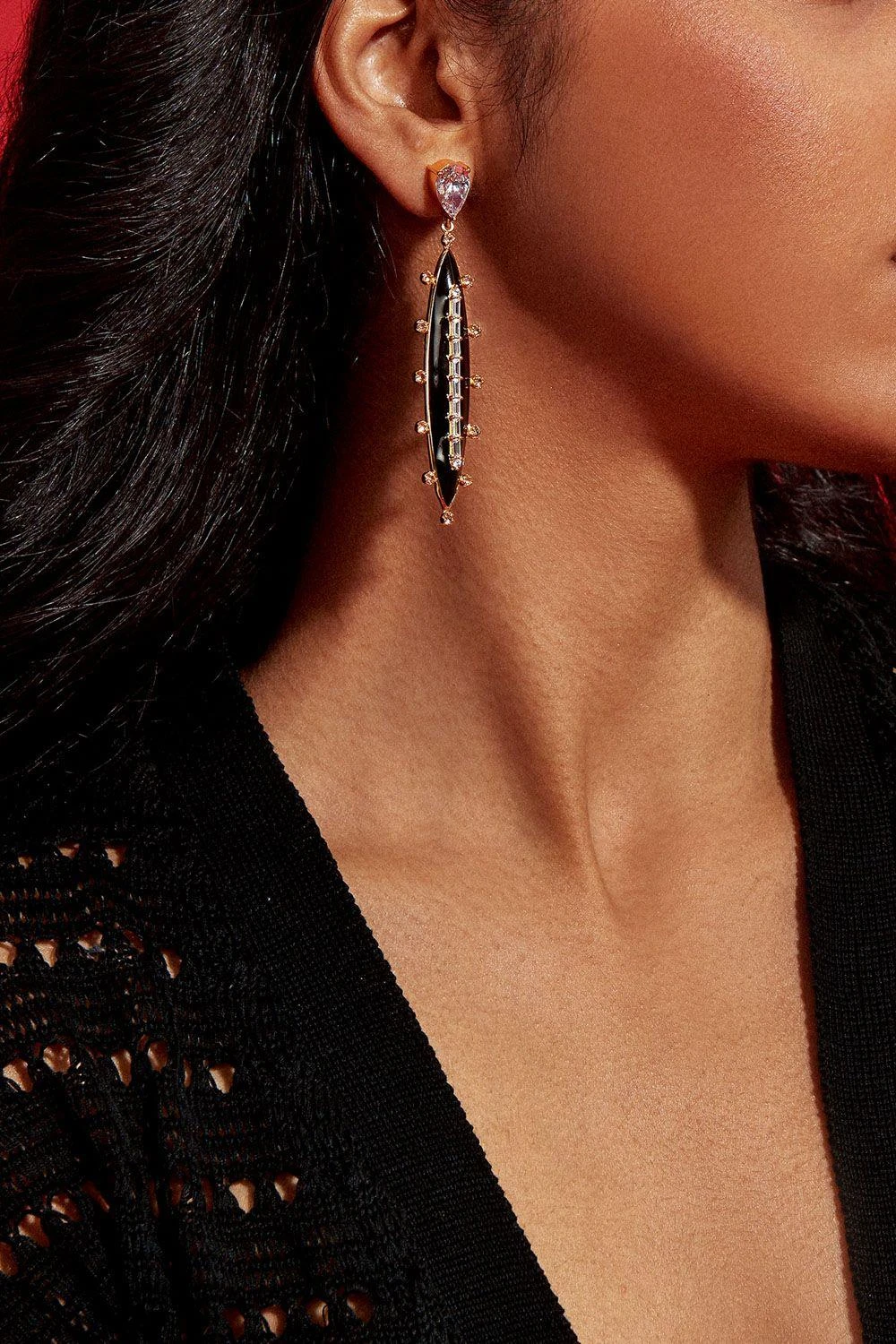 This statement pair of drop earrings is carved out in an elongated oval shape. Crafted with rich stones like Morning Star and Champagne Glare, and coupled with enamel work, these earrings exude a noir vibe.
