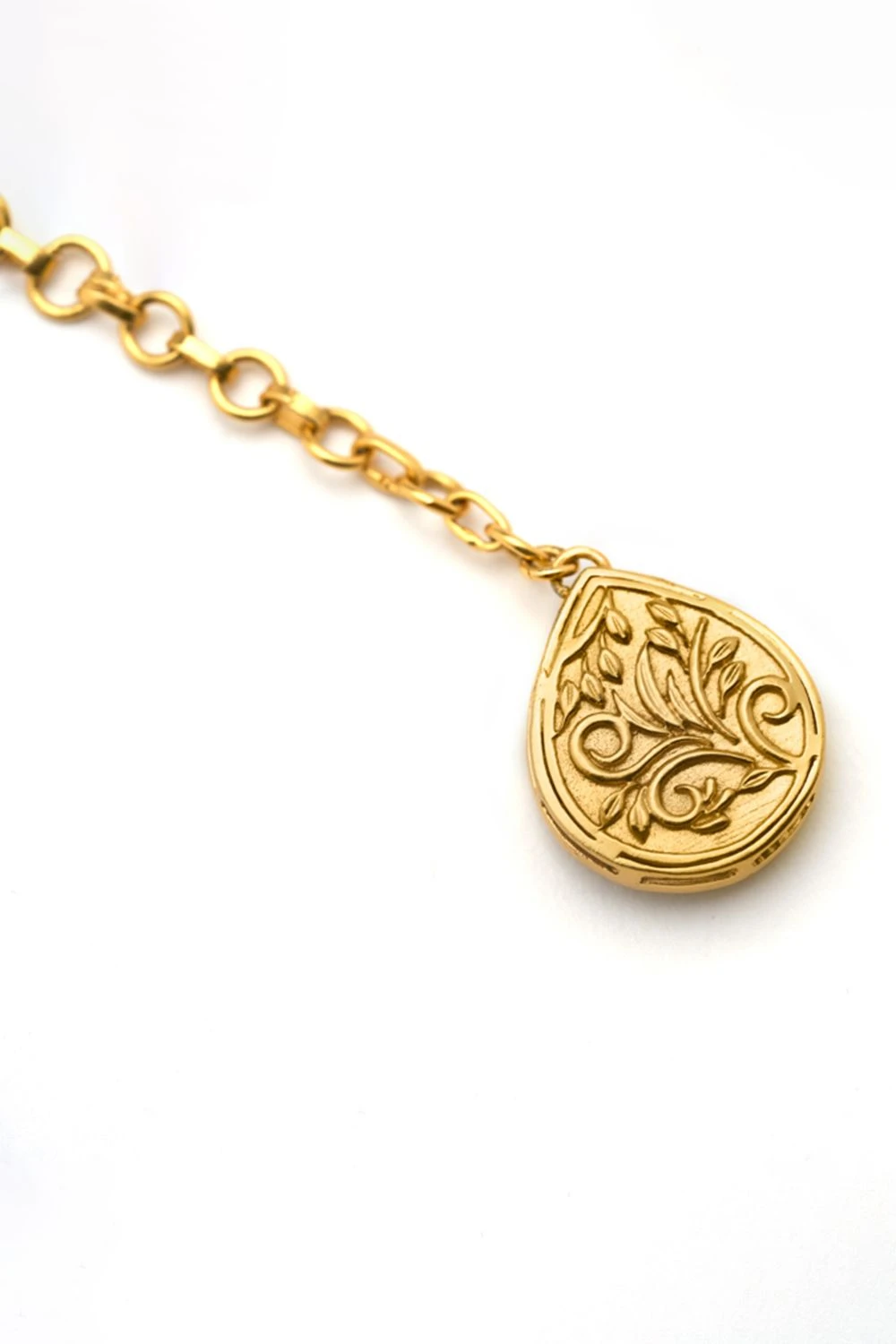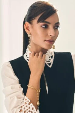 Indulge in the elegance of this delicate Kundan bracelet. Adorned with a stone-studded dangling motif, it effortlessly transitions from day to evening occasions.