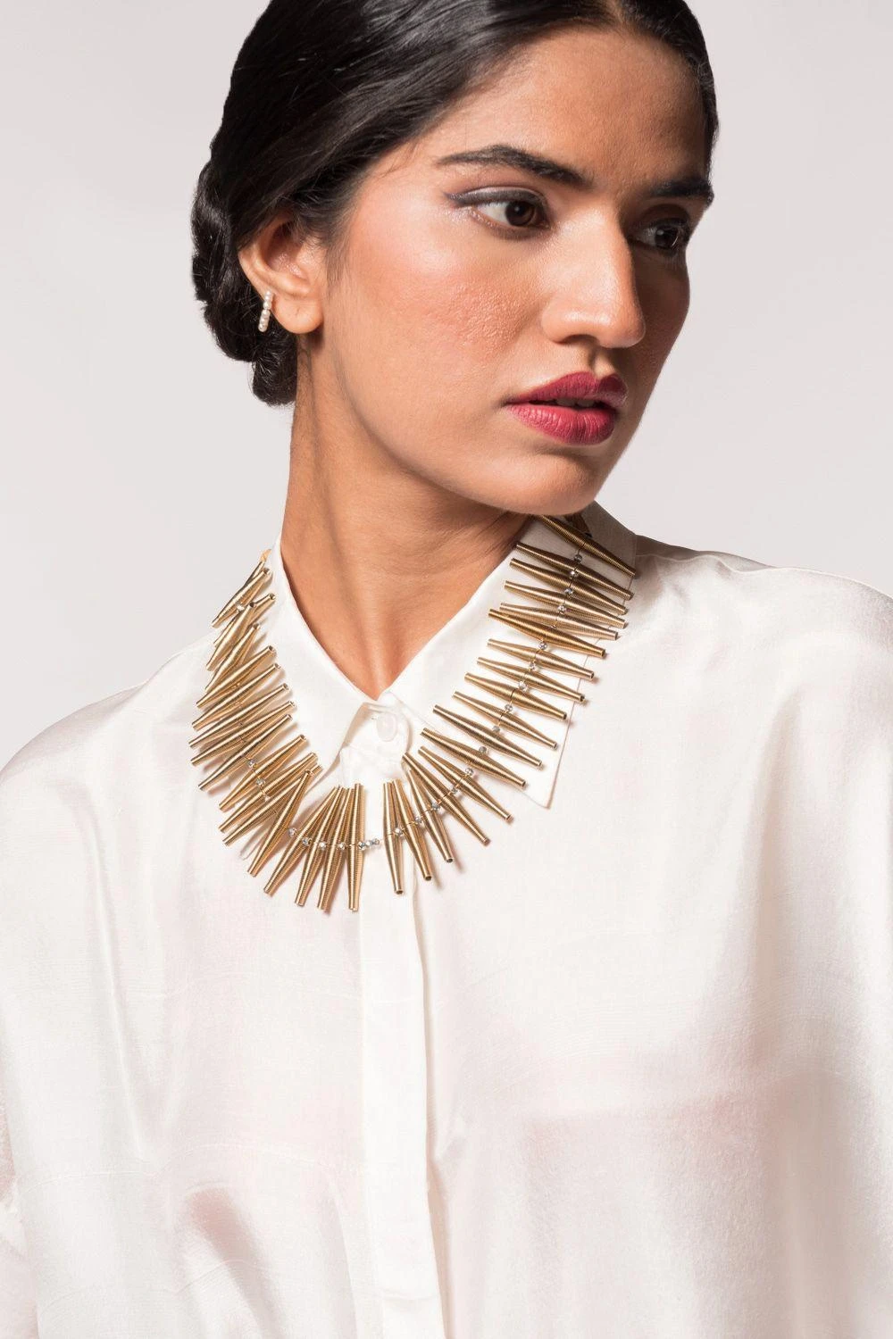 Accentuate your neckline with this ornate golden necklace made in plated steel spring and embedded with silver swarovski balls. You can style it with a long flowing black or white gown.