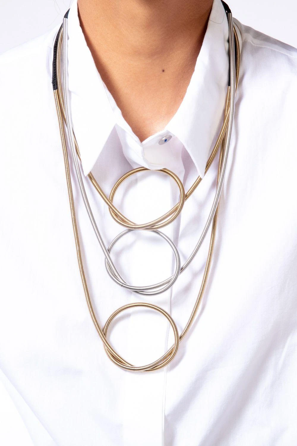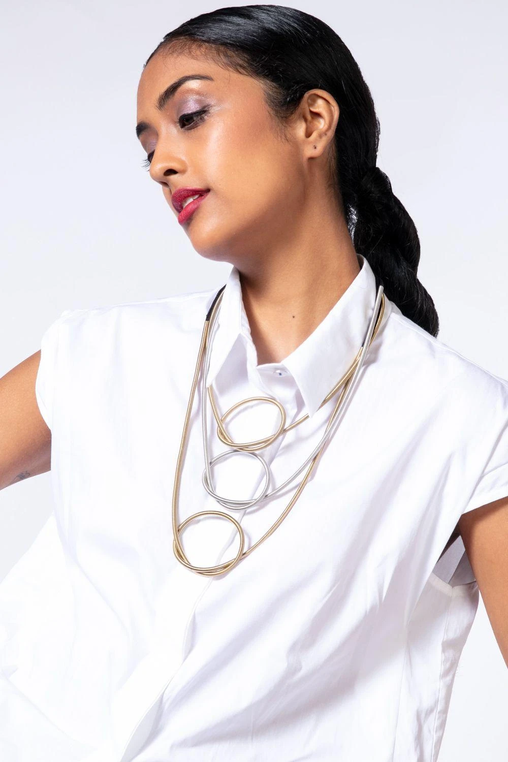 Accessorize your looks with this chic & statement layered necklace. It is made of unique plated spring steel in a knotted pattern. Style it with your workwear for a quick elevation.