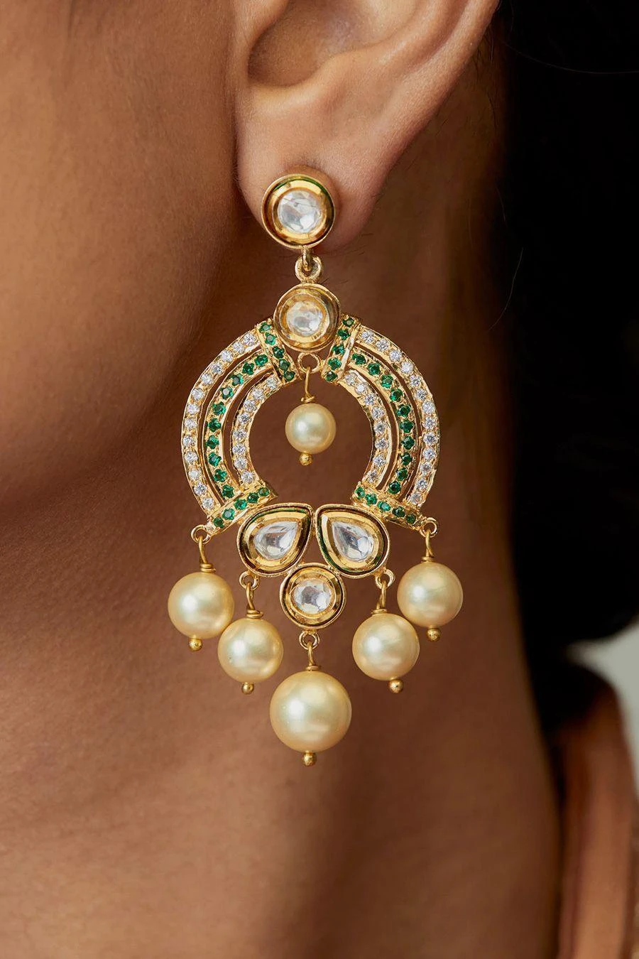 These scene-stealing earrings are an instant pick-me-up to any look. Crafted in copper & silver, these statement pearl chandbaali earrings have a distinct look that instantly spruces up your outfit.