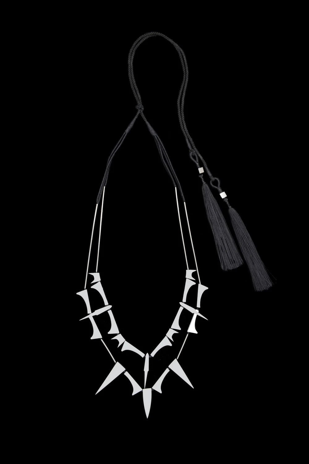 This black thread & stainless steel necklace is a statement piece. It can be styled with a white top or a solid coloured dress to instantly elevate your look.