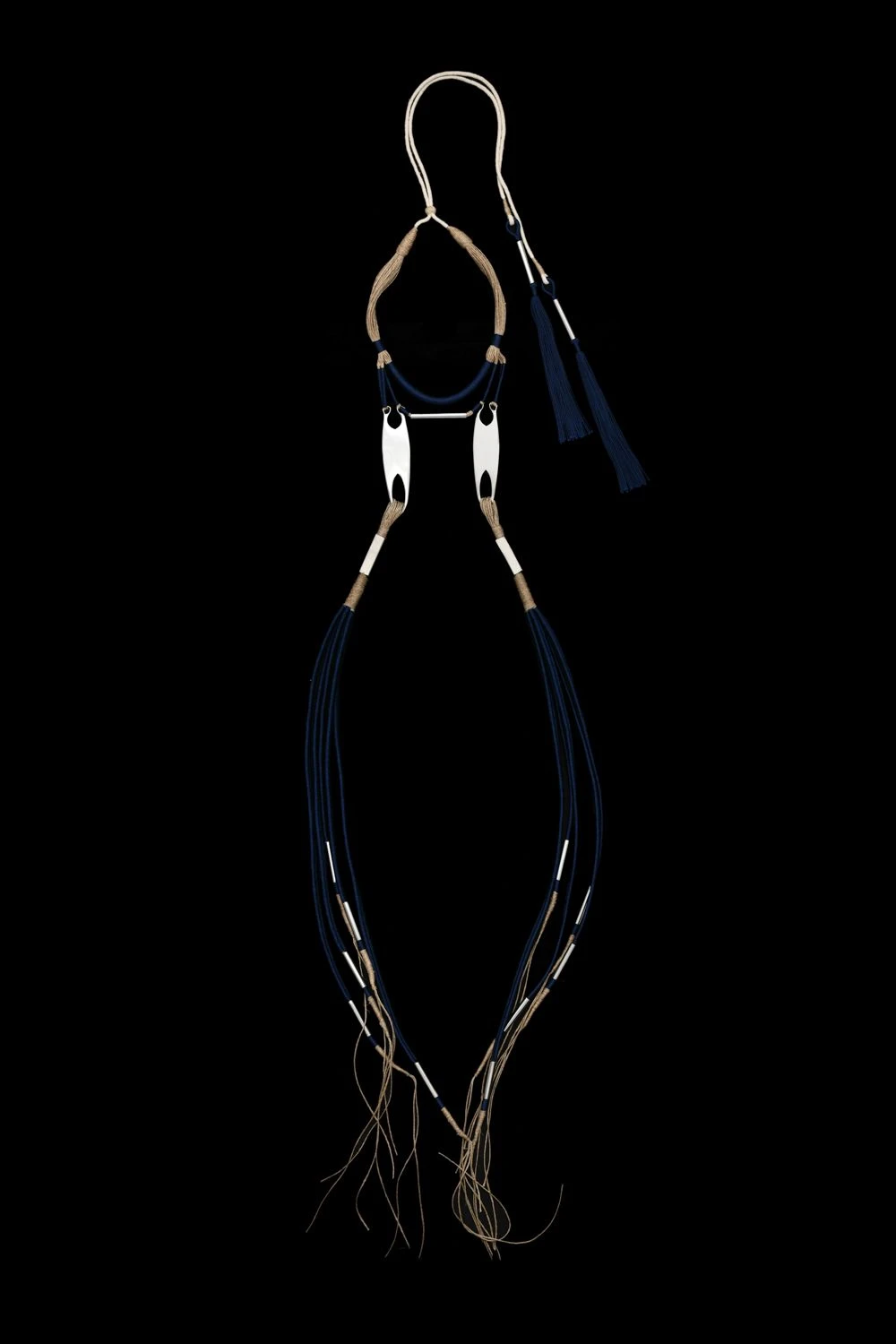 This one of a kind blue jute thread necklace has unique stainless steel details. Style this chic piece over a top or a jumpsuit to accessorise.