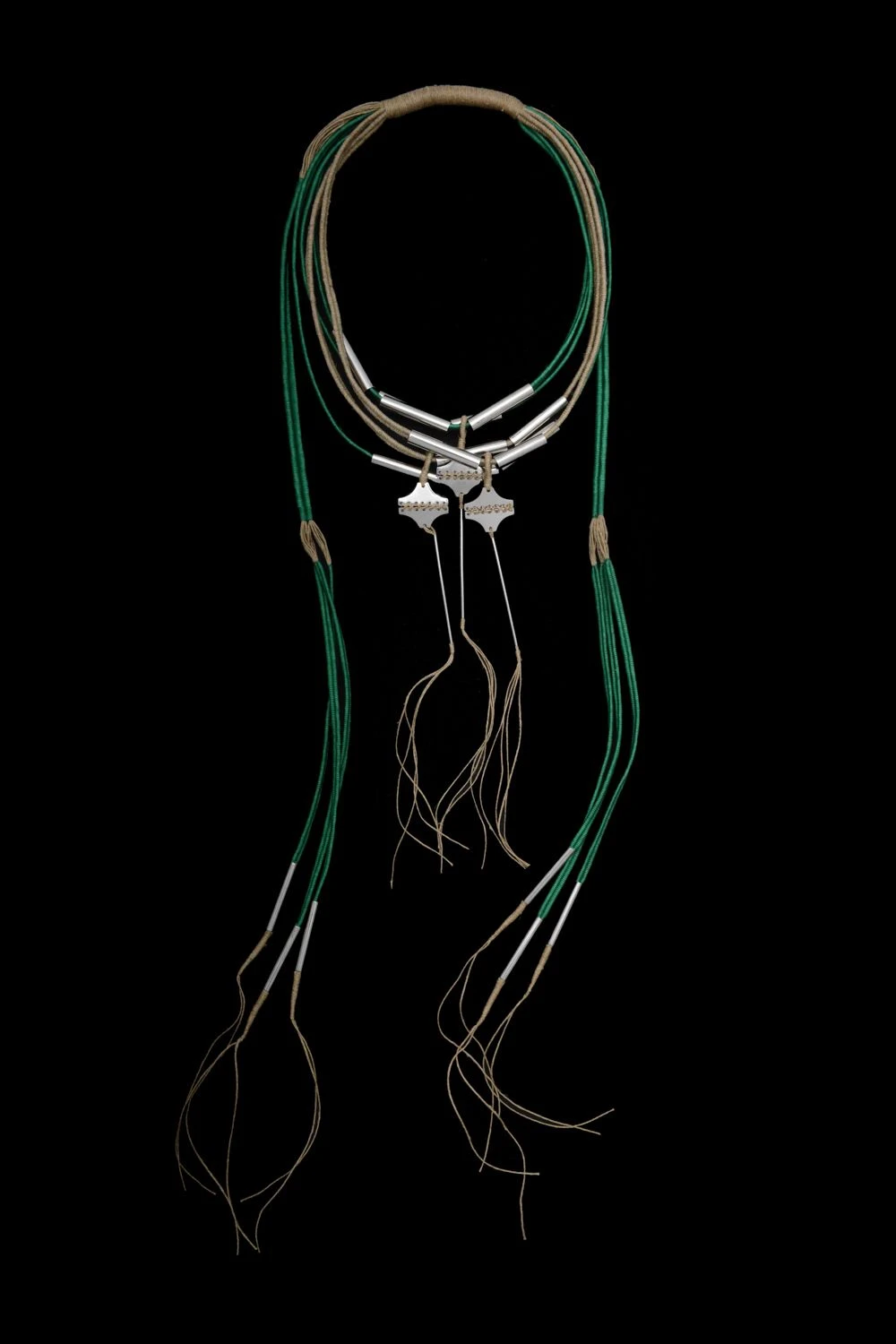 For an effortless edgy look, this emerald green threaded necklace is a great option. It is curated in fine threads, jute with stainless steel eclectic accents. You can style it with a kaftan for a chic look.