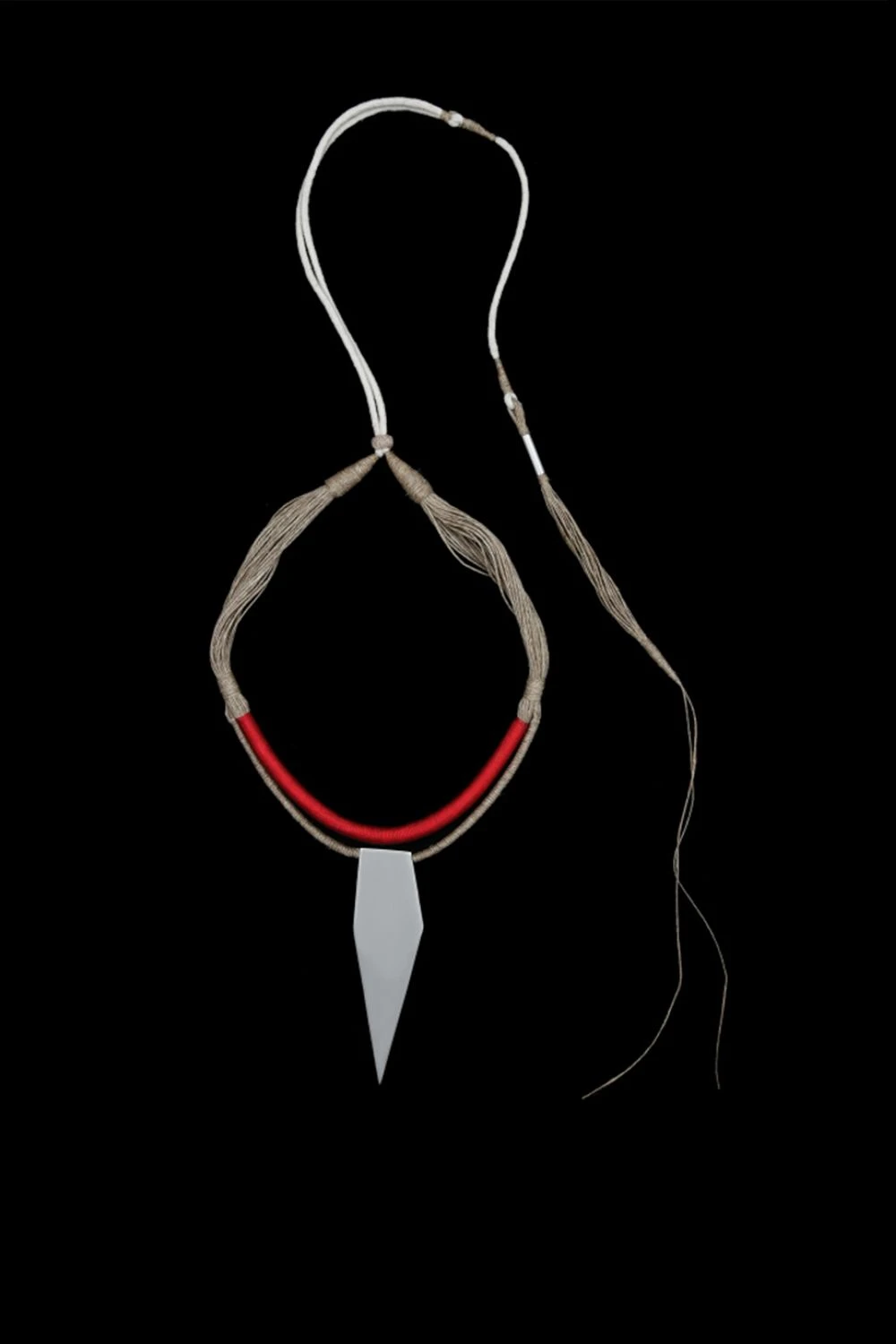 Elevate your understated looks with this statement necklace. It is curated in jute & red thread with a stainless steel pendant in the center. You can team it up with a monochrome tunic or dress.