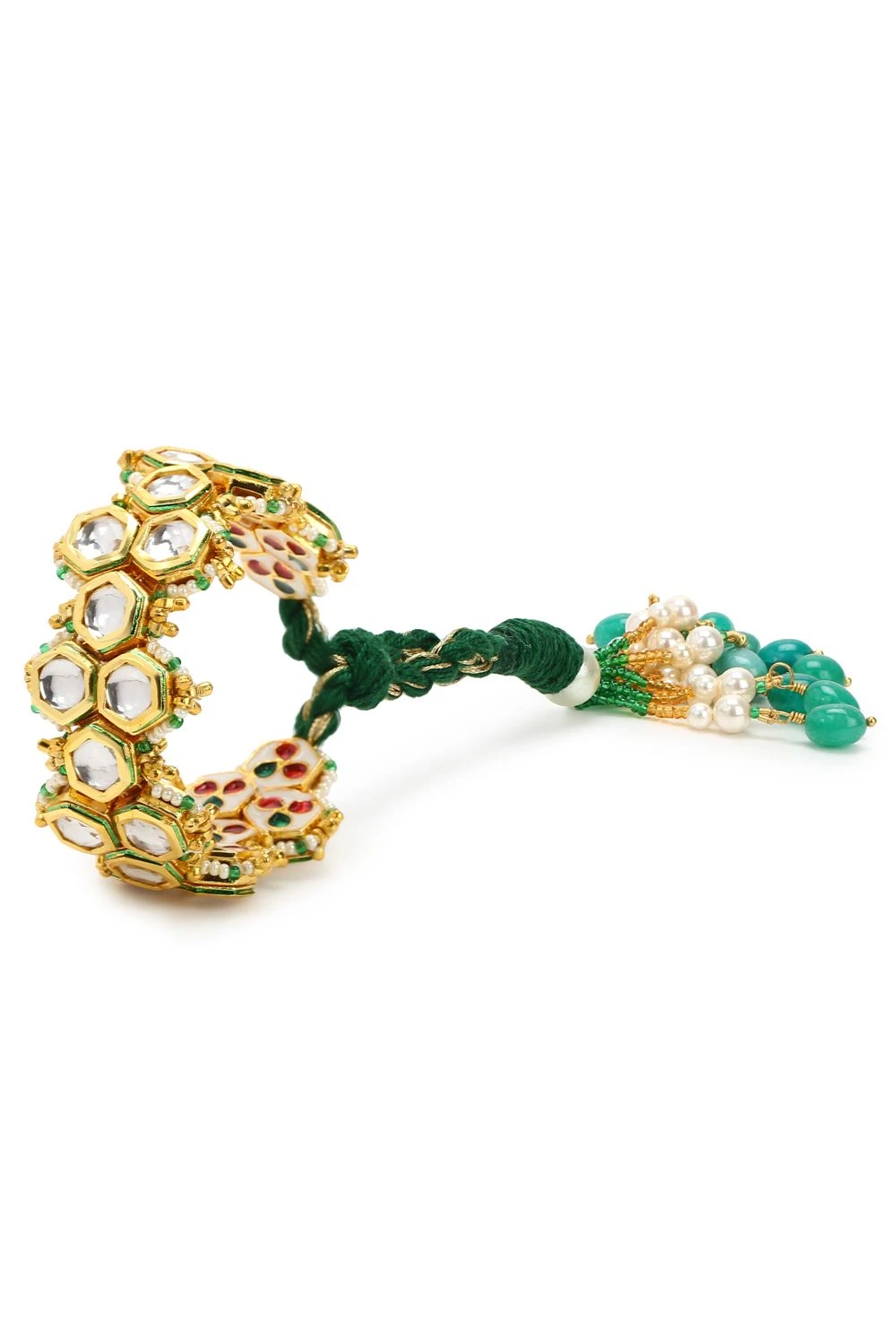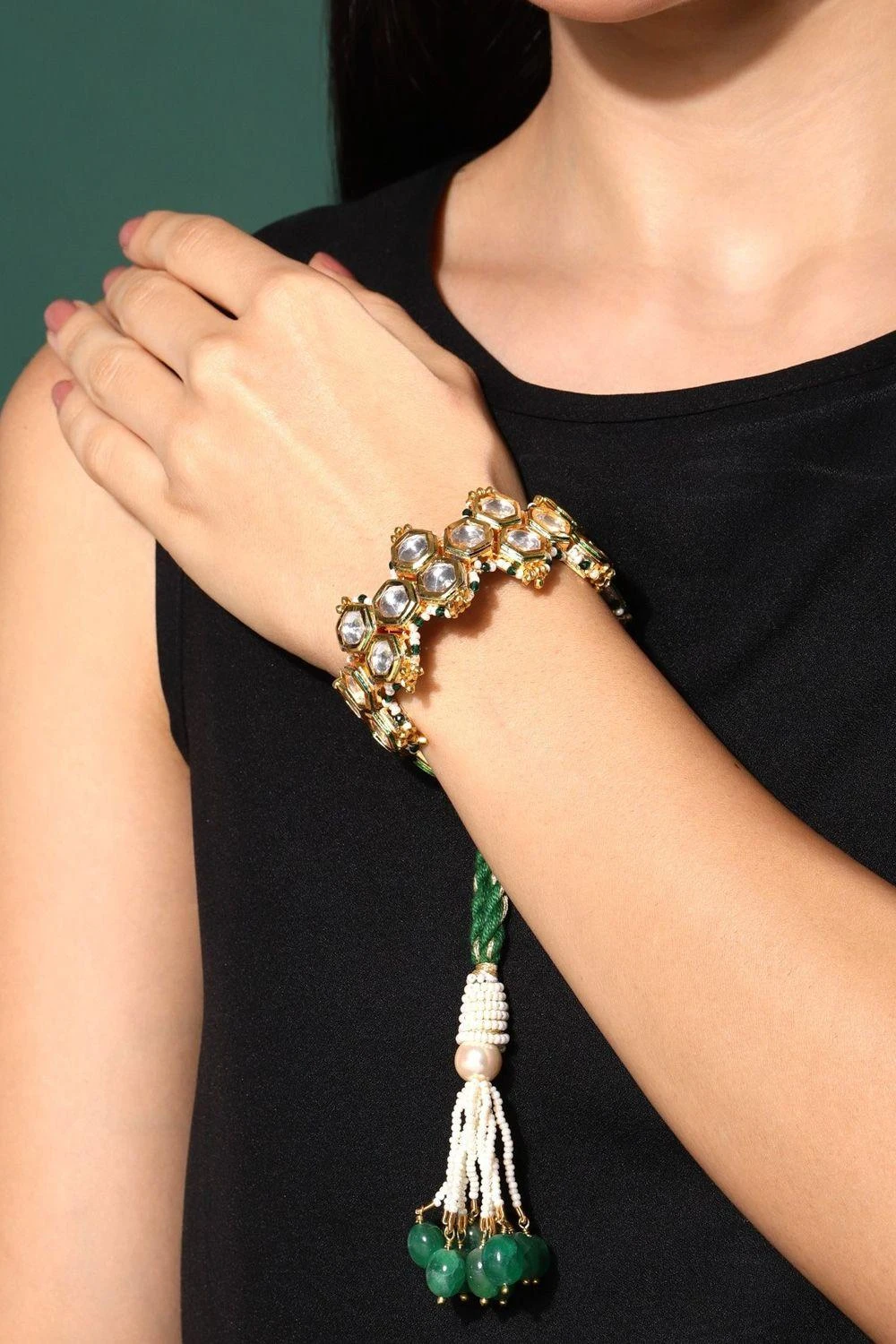 This masterpiece features hexagonal-shaped polkis adorned with pearls, creating a captivating pattern around the wrist. Enhancing its allure is an adjustable ruby red and gold thread dori, adorned with a dangling looped tassel of exquisite pearls.