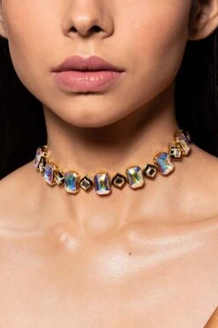This Amara necklace is a great accessory to add an instant edge to your looks. This 18-karat gold-plated necklace is set with sparkling mirrors, CZ and crystals.