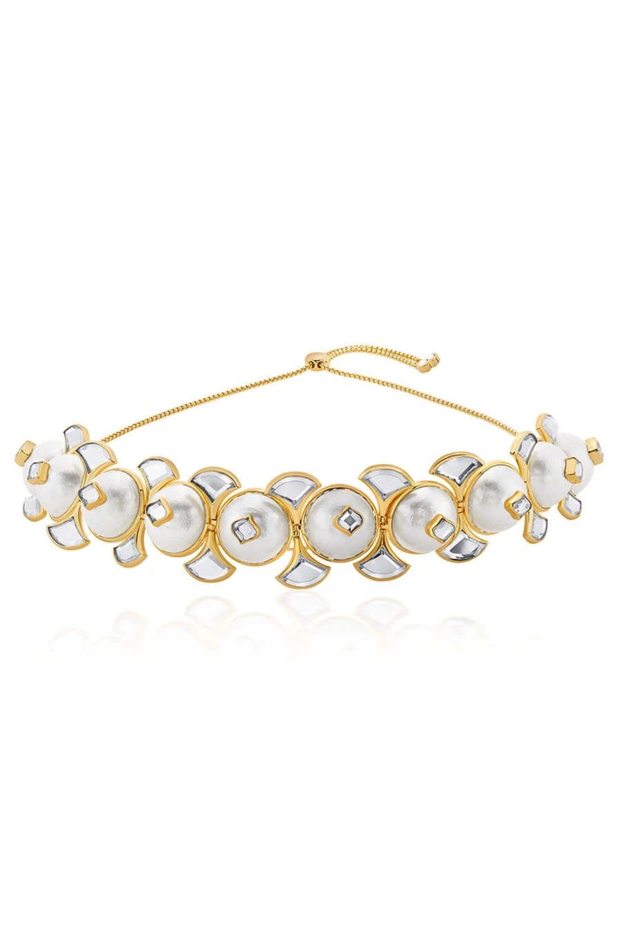 This Amara choker is a great accessory to add an instant edge to your looks. This exquisite piece is crafted with cotton ball pearls, CZ and handcut mirror motifs inspired by the Mughal era, set in 18k gold-plating.