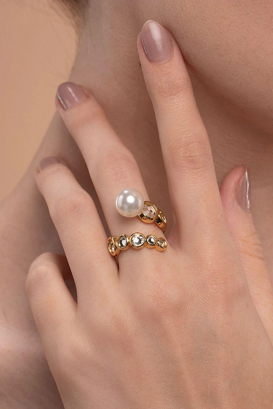 This Amara ring is a great accessory to add an instant edge to your looks. This wrap-style ring plated in 18k gold is punctuated with CZ crystals and an elegant shining pearl.