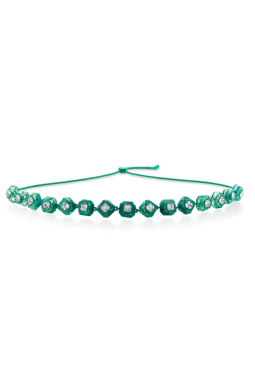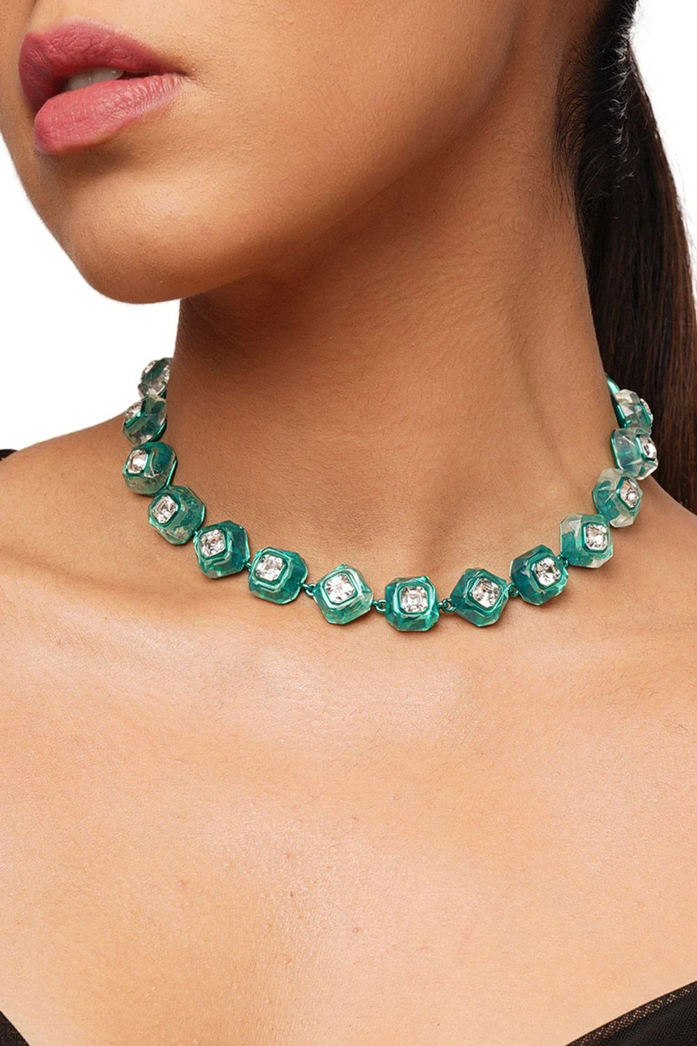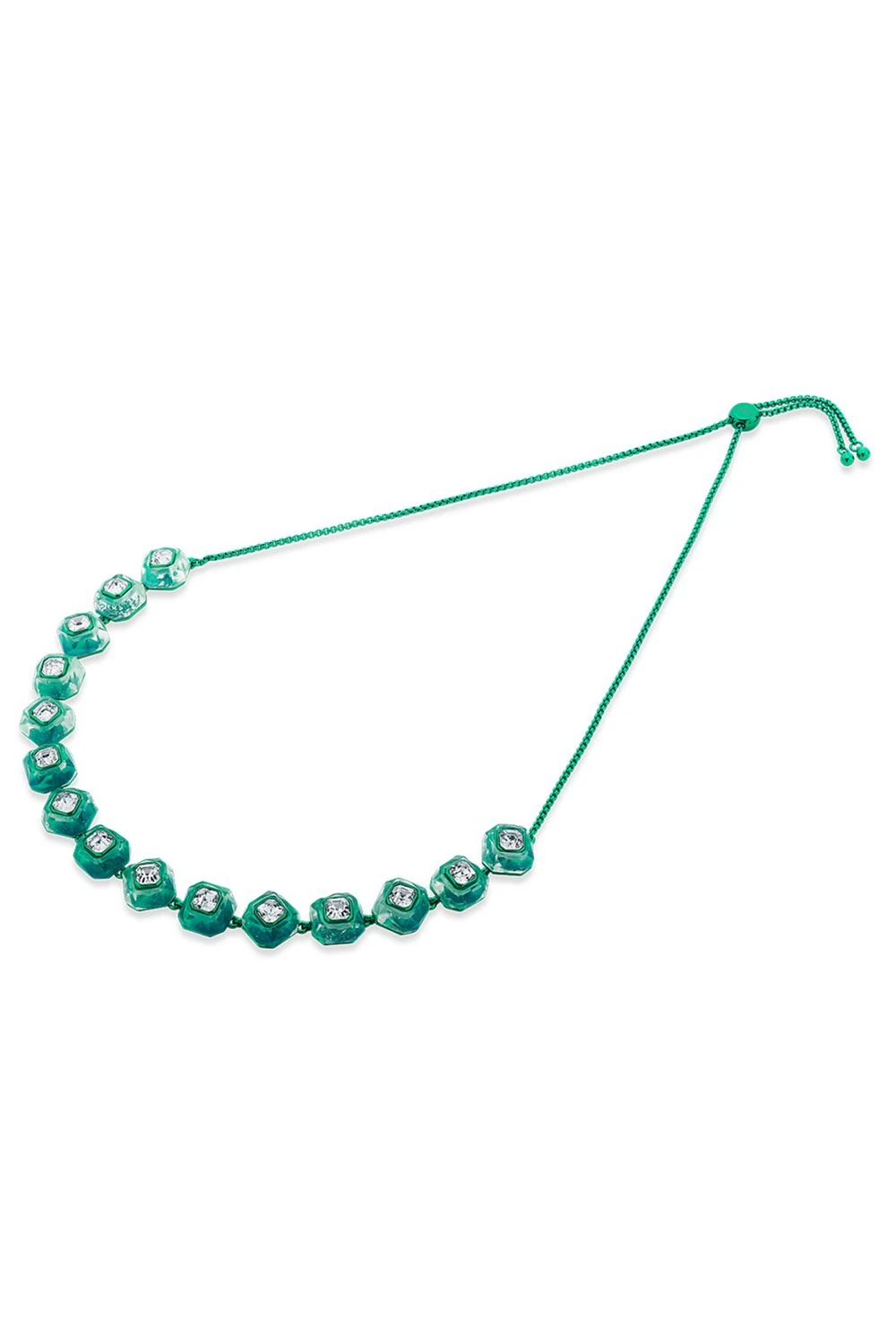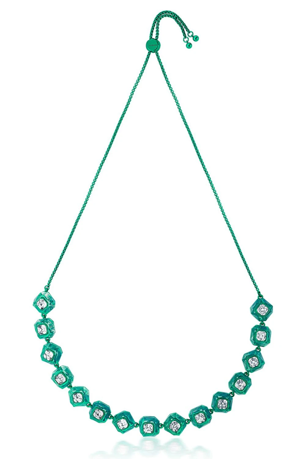Immerse yourself in the opulence of this colour-plated necklace, adorned with a captivating string of light-catching crystals in enchanting green. Crafted from infinity cut resin, it is elevated with exquisite enamel detailing.