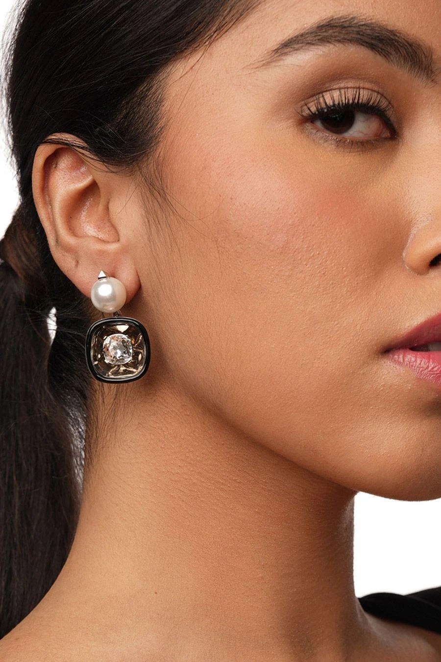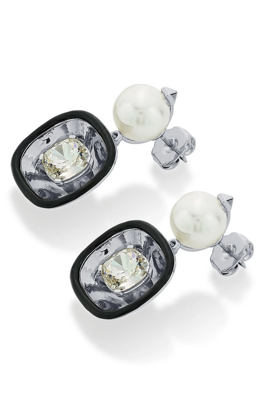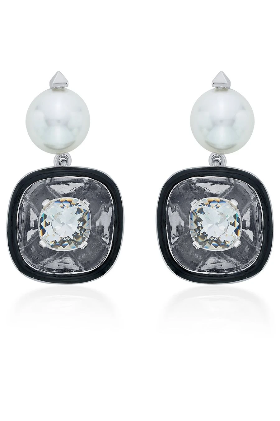 Adorn yourself with these mesmerizing rhodium-plated earrings, featuring a resplendent pearl that exudes an unparalleled allure, and an enameled crystal that shimmers with a luminous radiance,