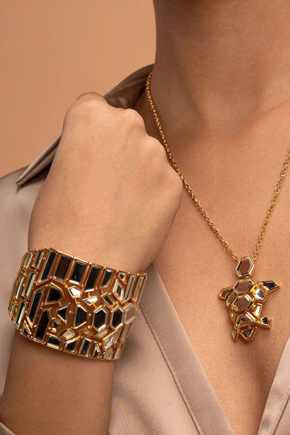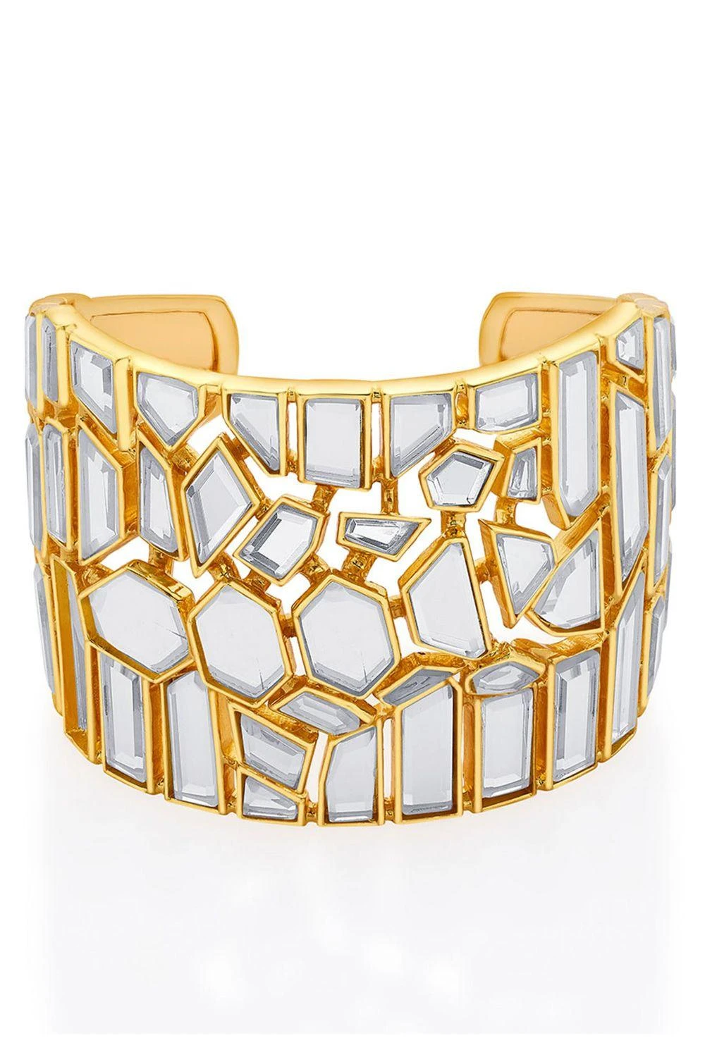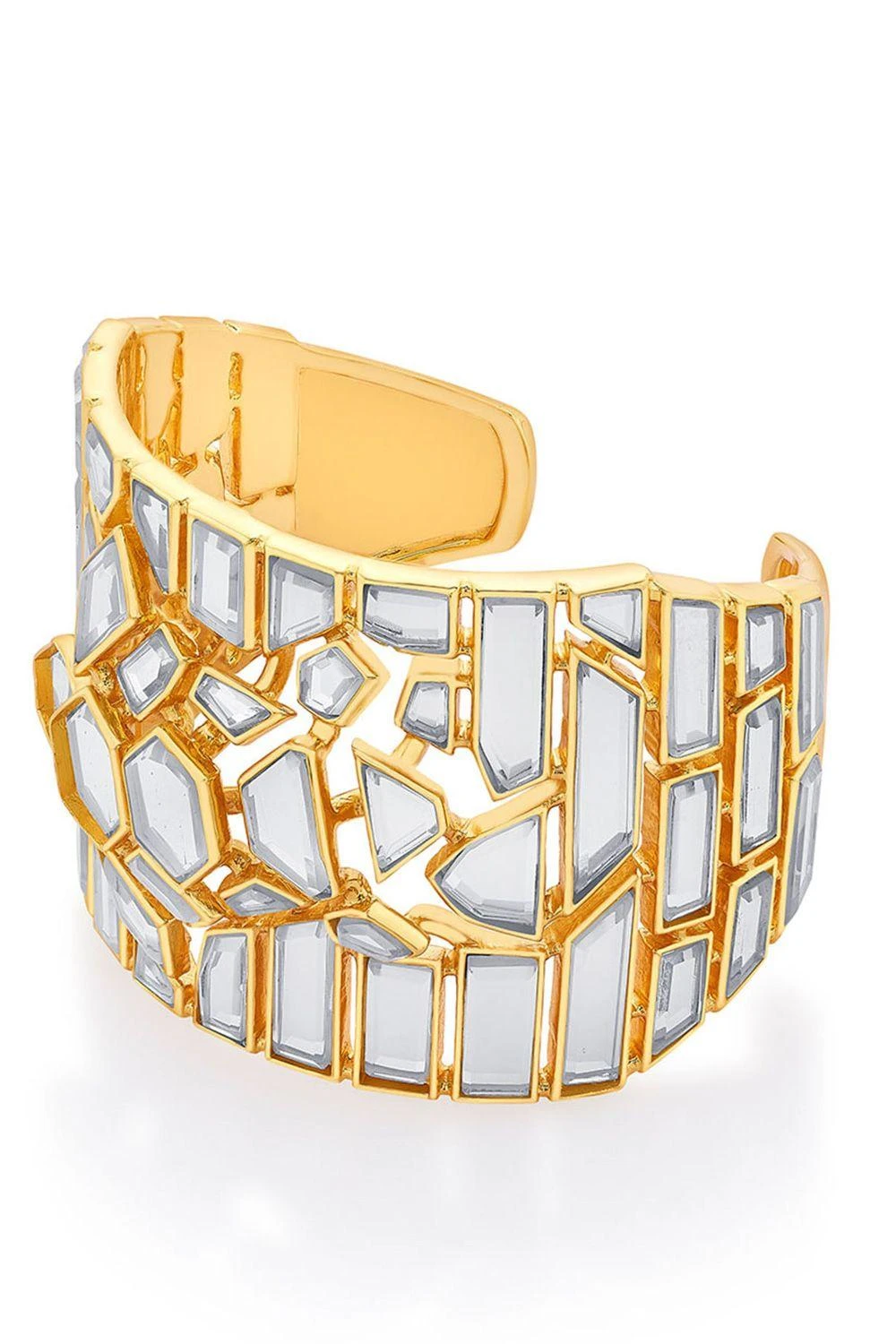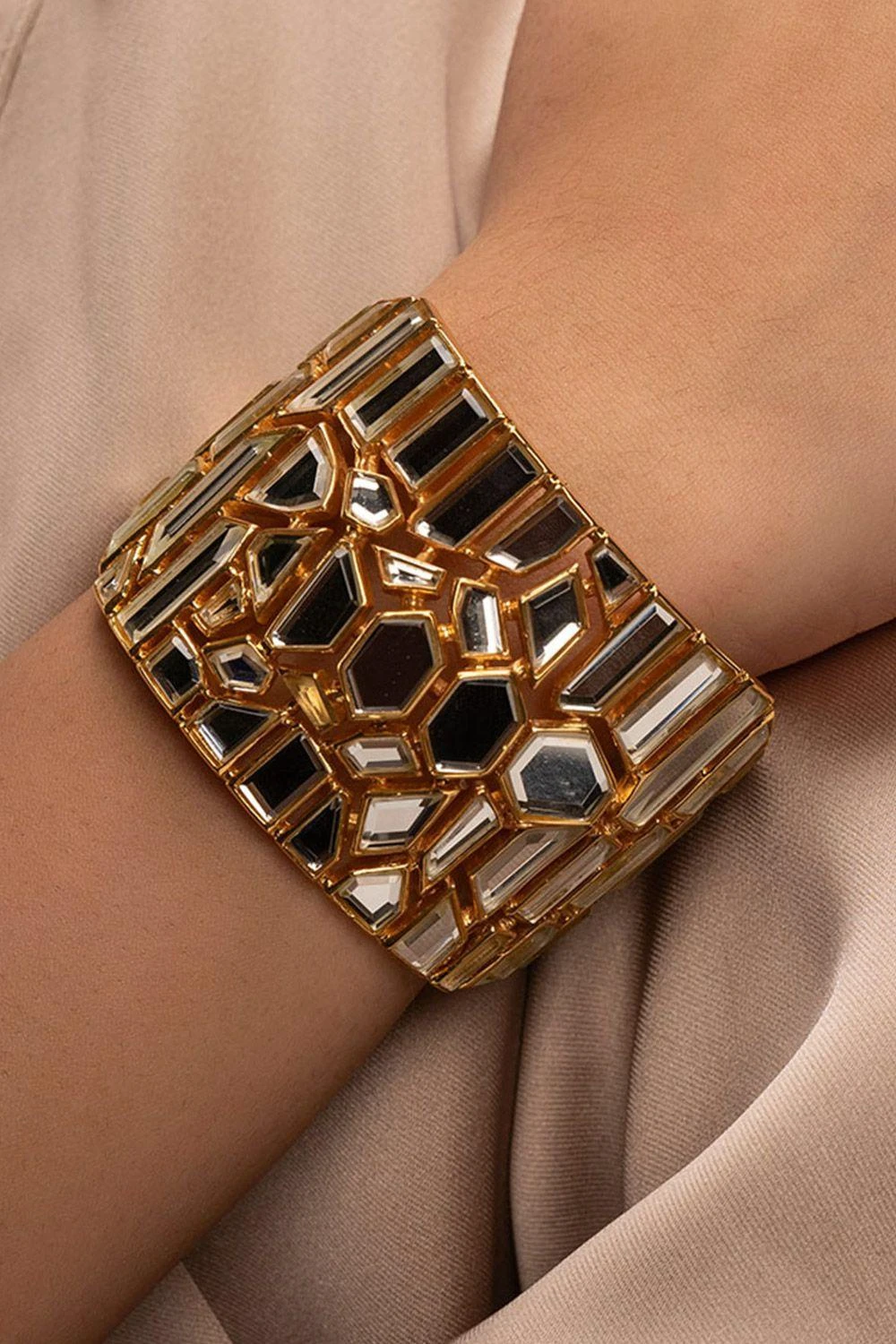 Enhance your wardrobe with our stunning Fiesta Hydro Emerald Irregular Cuff. Impeccably crafted with mirror, radiant emerald stone, and lustrous 18K gold plating, this wristwear promises an exclusive, sophisticated allure.