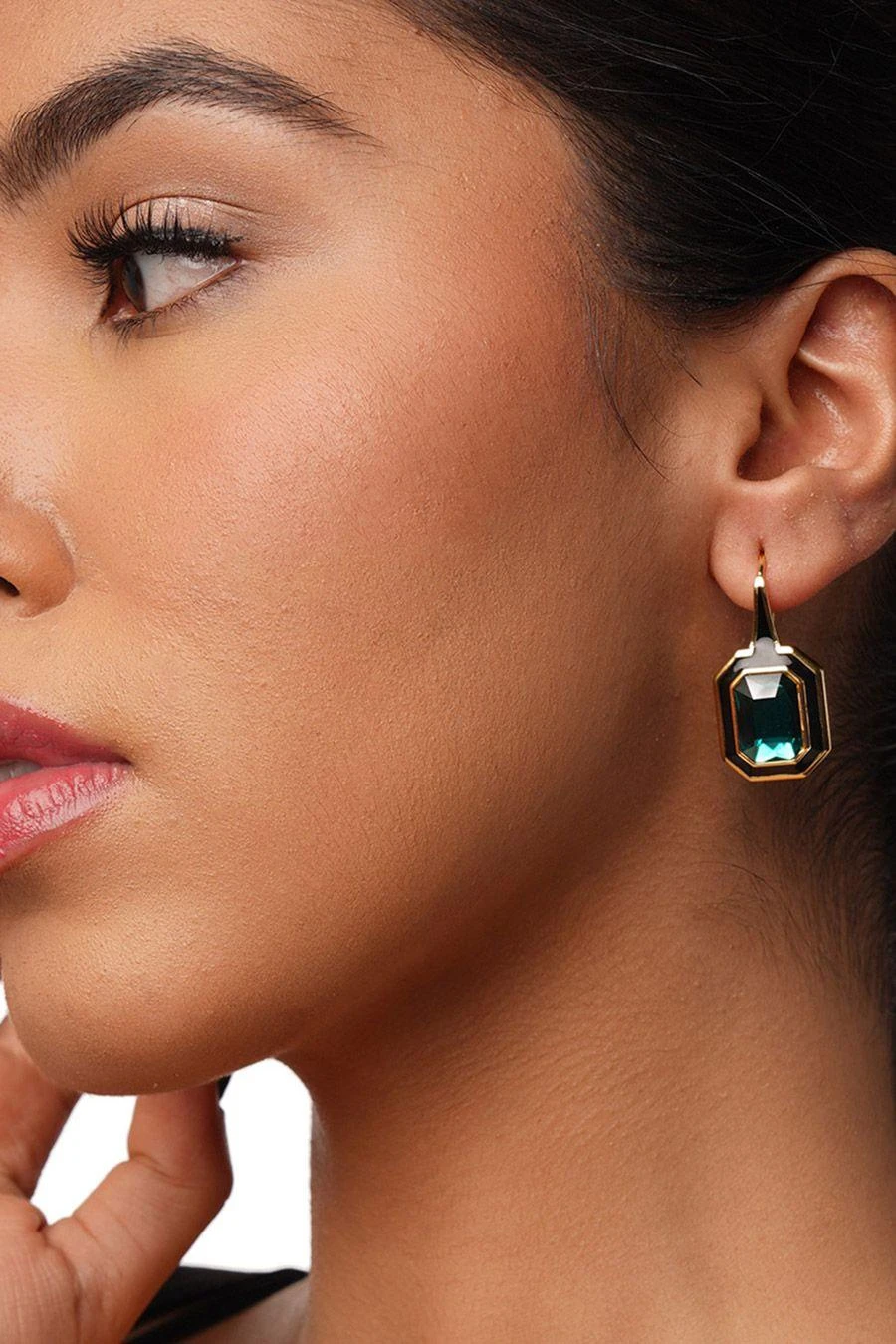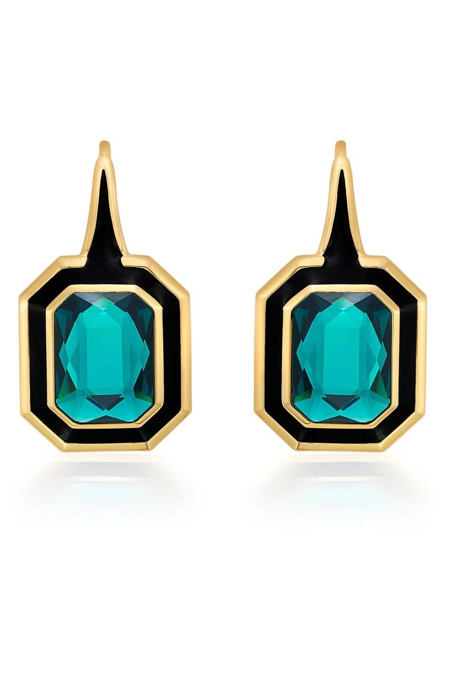 These peerless 18-karat gold-plated earrings, bearing the signature stamp of Isharya’s mastery, dazzle with a radiant enameled crystal and intricate enameling, exuding a mesmerizing aura of sophistication and elegance.