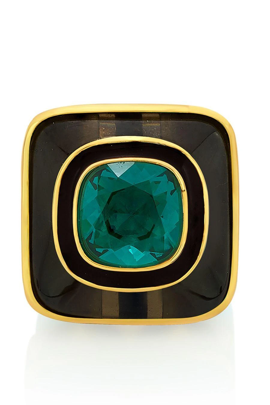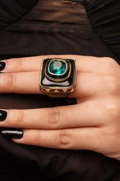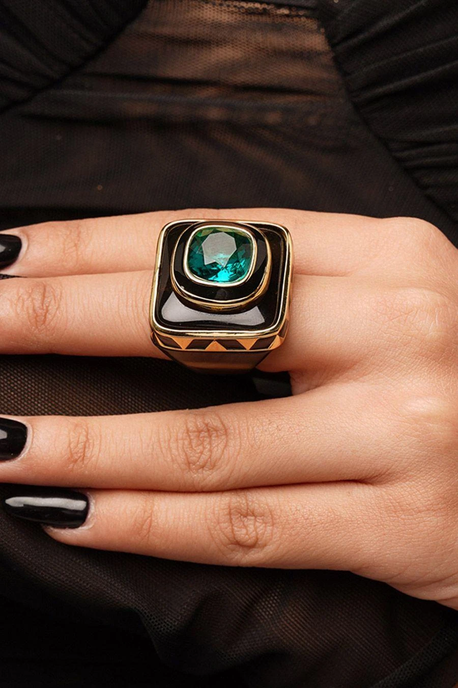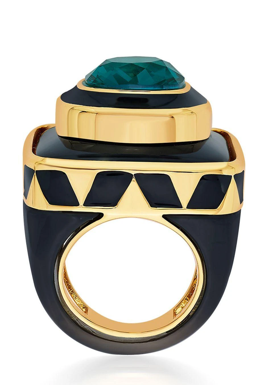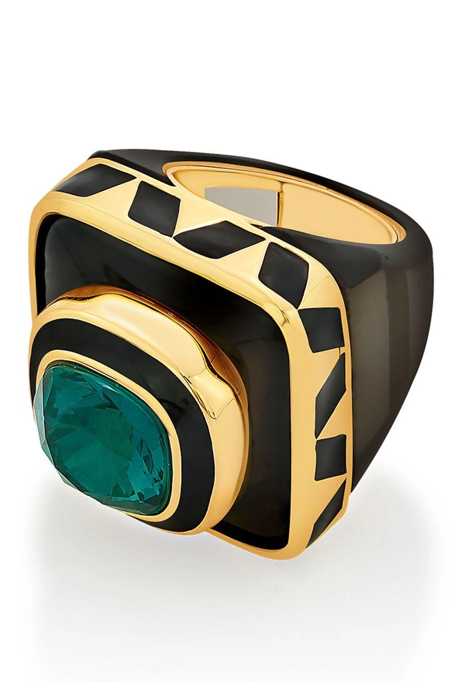 Cast from black lucent resin & a striking black enamel finish, this ring is elevated with a green crystal. Whether worn as a standalone piece or layered with gold bands, this ring exudes a timeless charm that is sure to make an everlasting impression