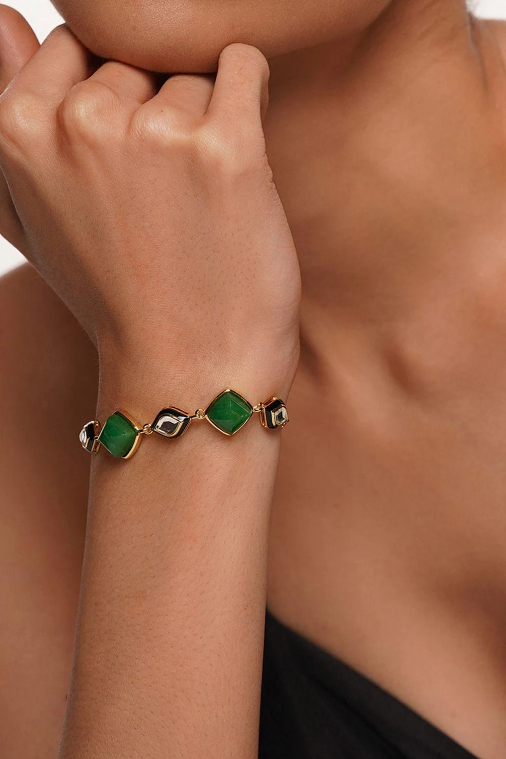 Embrace understated luxury with this versatile 18-karat gold-plated bracelet, showcasing a delicate row of polki-cut mirrors and accentuated by mesmerizing green jade. A refined addition to any ensemble, it effortlessly exudes timeless elegance.
