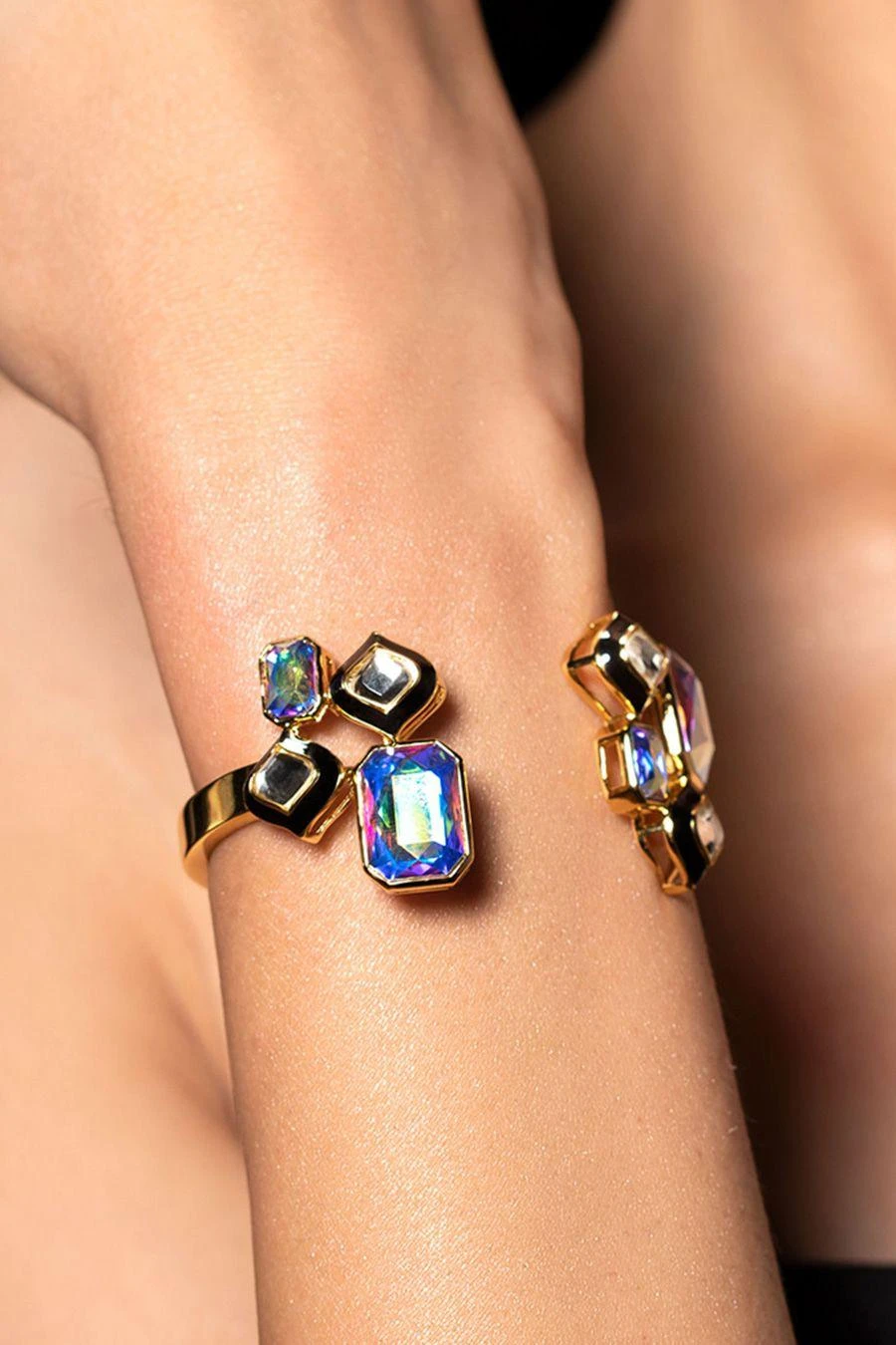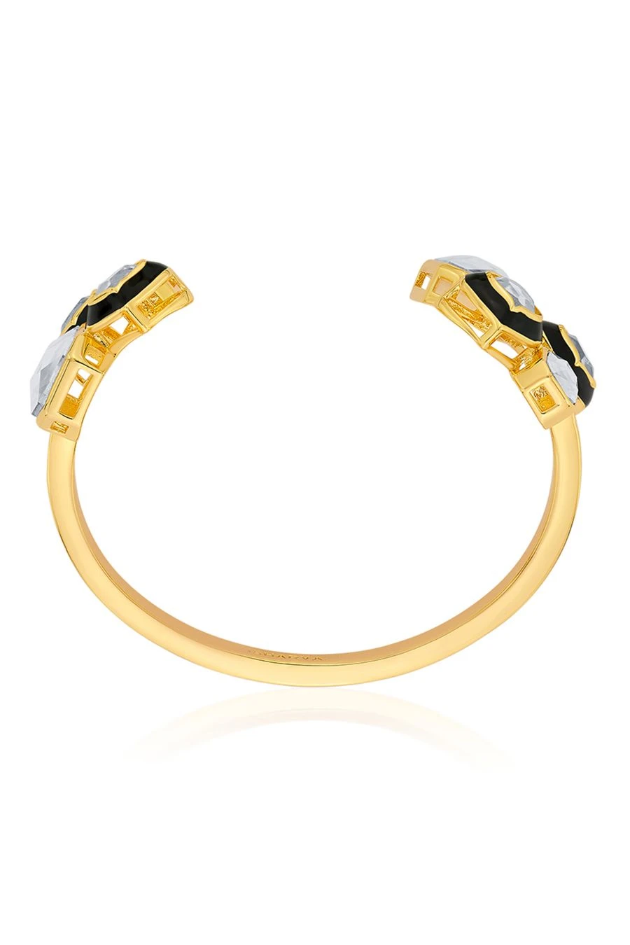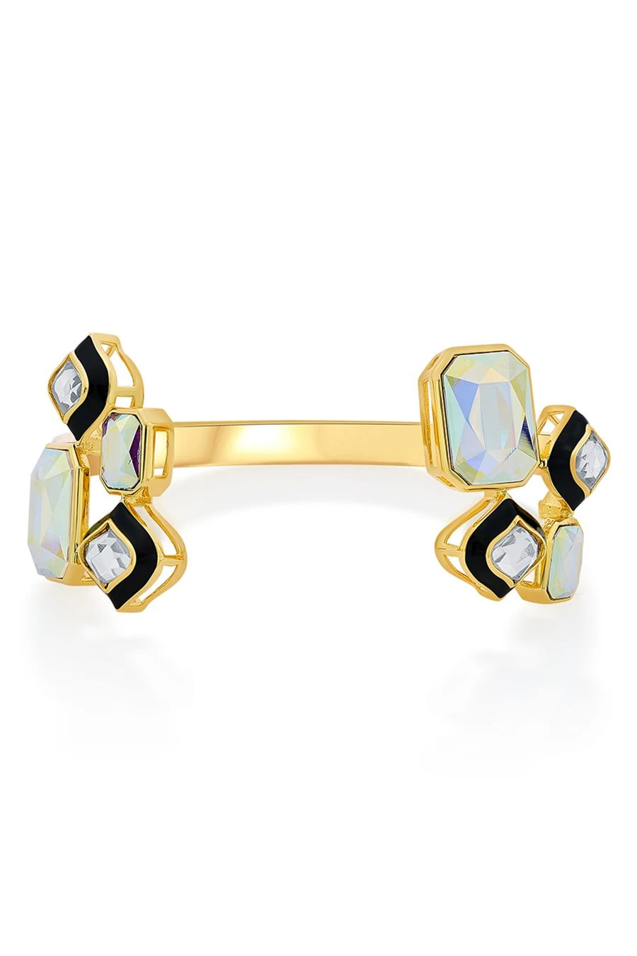 This Meher cuff is a great accessory to add an instant edge to your looks. This 18-karat gold-plated cuff is cast from shimmering mirrors and crystals. The open silhouette ends make it easy to slip on and off.