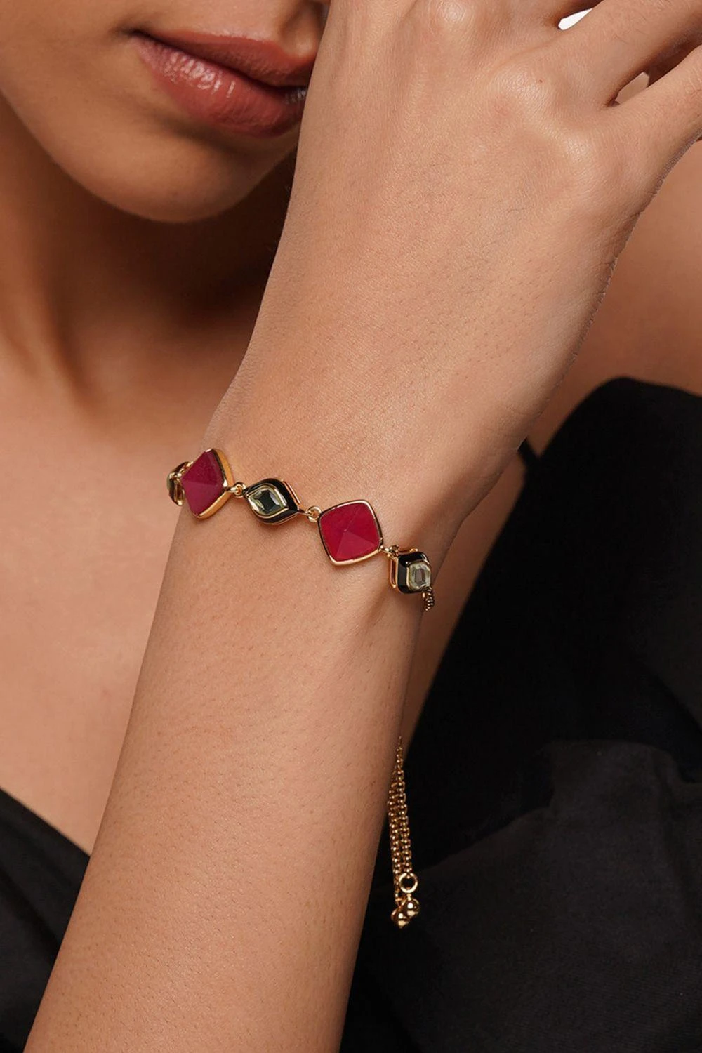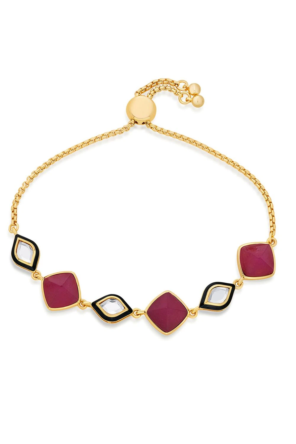 Elevate your style with this exquisite 18-karat gold-plated bracelet. Its pared-down design showcases a row of captivating polki-cut mirrors, beautifully complemented by the delicate pink jade.