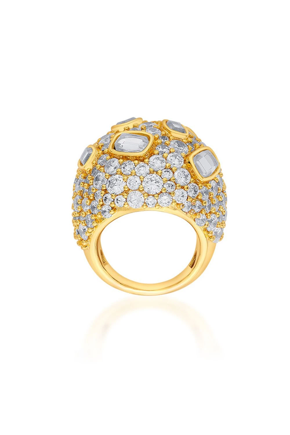 Dive into luxury with this meticulously crafted Baroque Gold Ring. 18-karat gold-plating adorned with CZs and mirrors in a baroque pattern delivers unparalleled elegance.