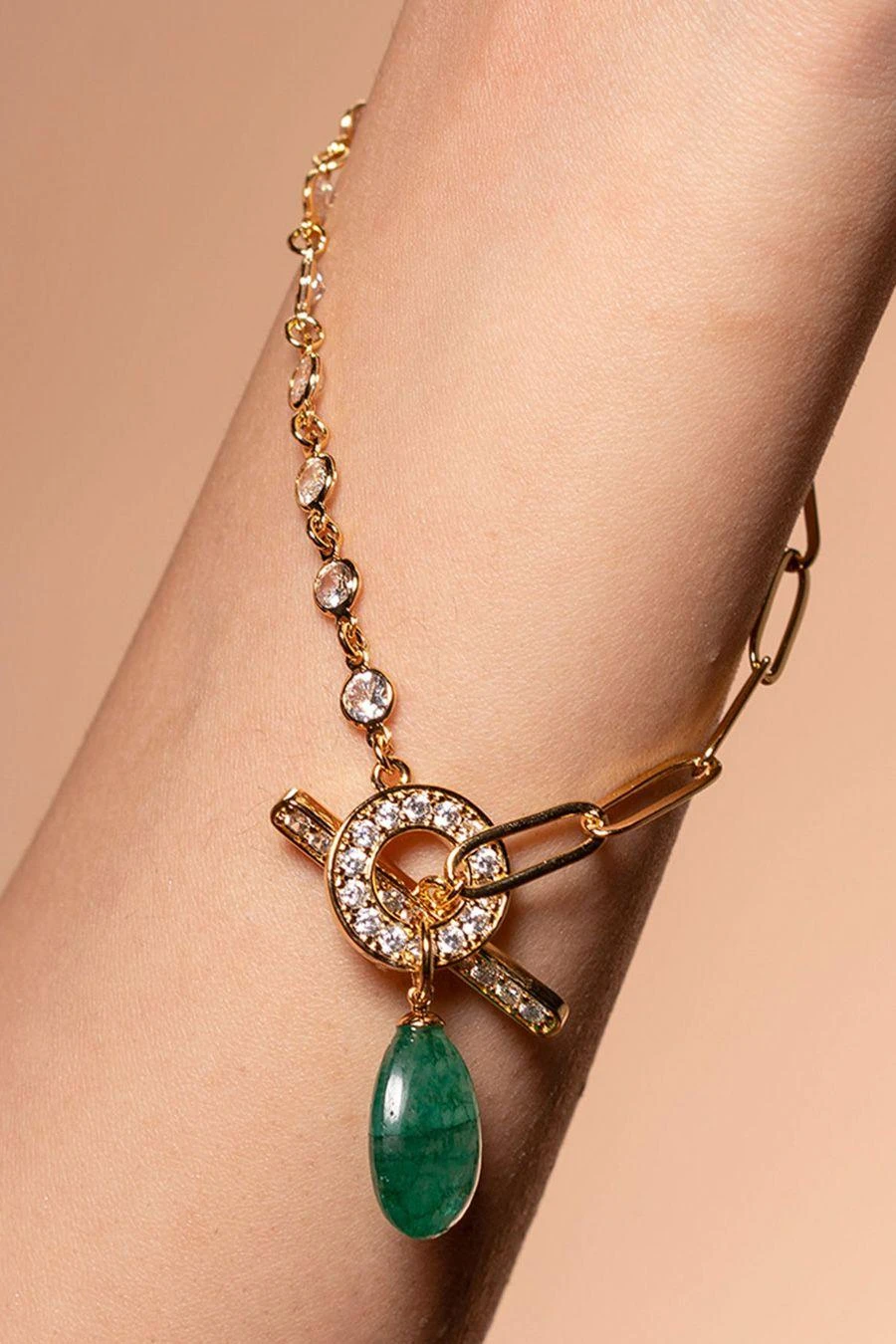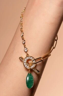 This bracelet pays tribute to the intricate traditional techniques inspired by Mughal architecture with a modern spin. The piece is decorated with vibrant green quartz and CZ. The contrasting 18-karat gold-plated chain looks equally striking.