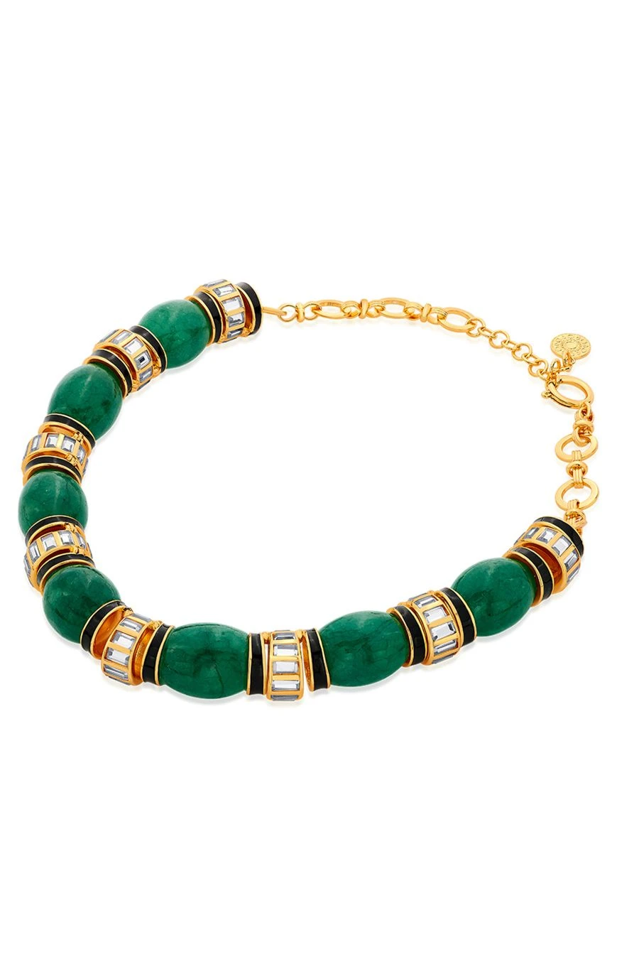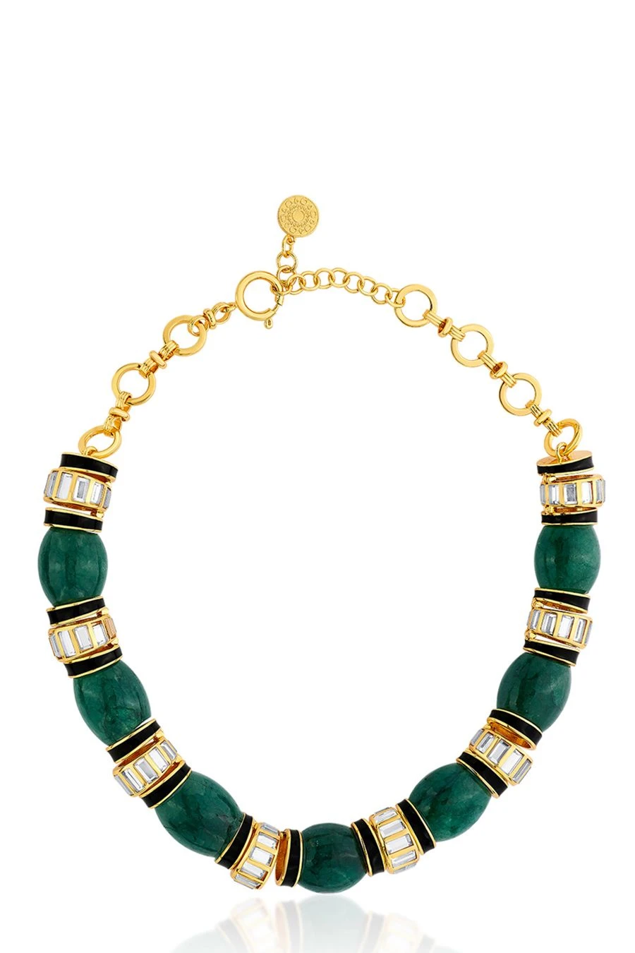 This Zeenat necklace is a great accessory to add an instant edge to your looks. This necklace is crafted with handcut mirrors, green quartz stones, enamel accents and plated in 18-karat gold.
