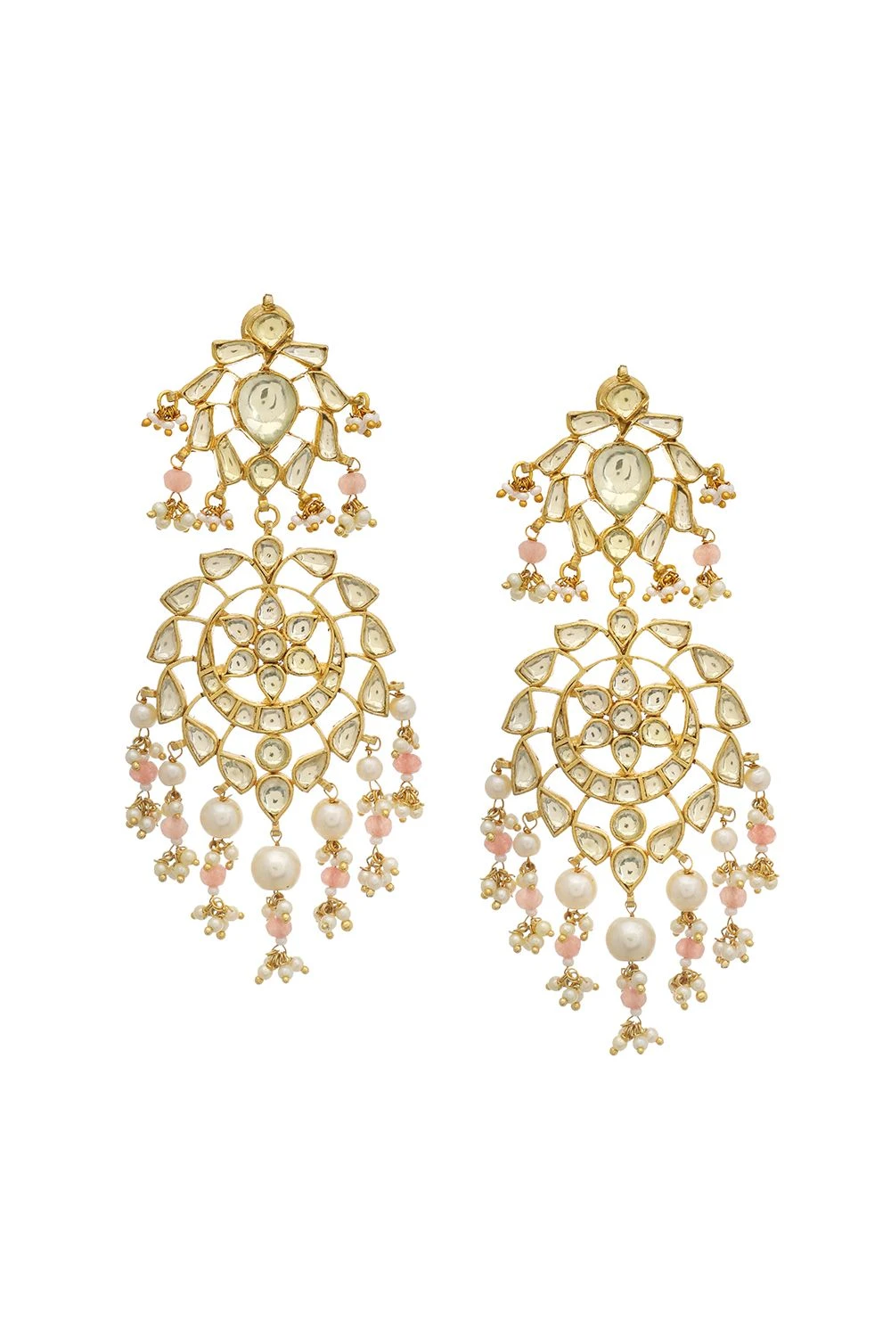 Adorn this pair of peach kundan earrings to your festive looks for a royal & elegant touch. It features subtle pearl embellishments made in a copper base making it a one-of-a-kind pair to have in your jewellery box.