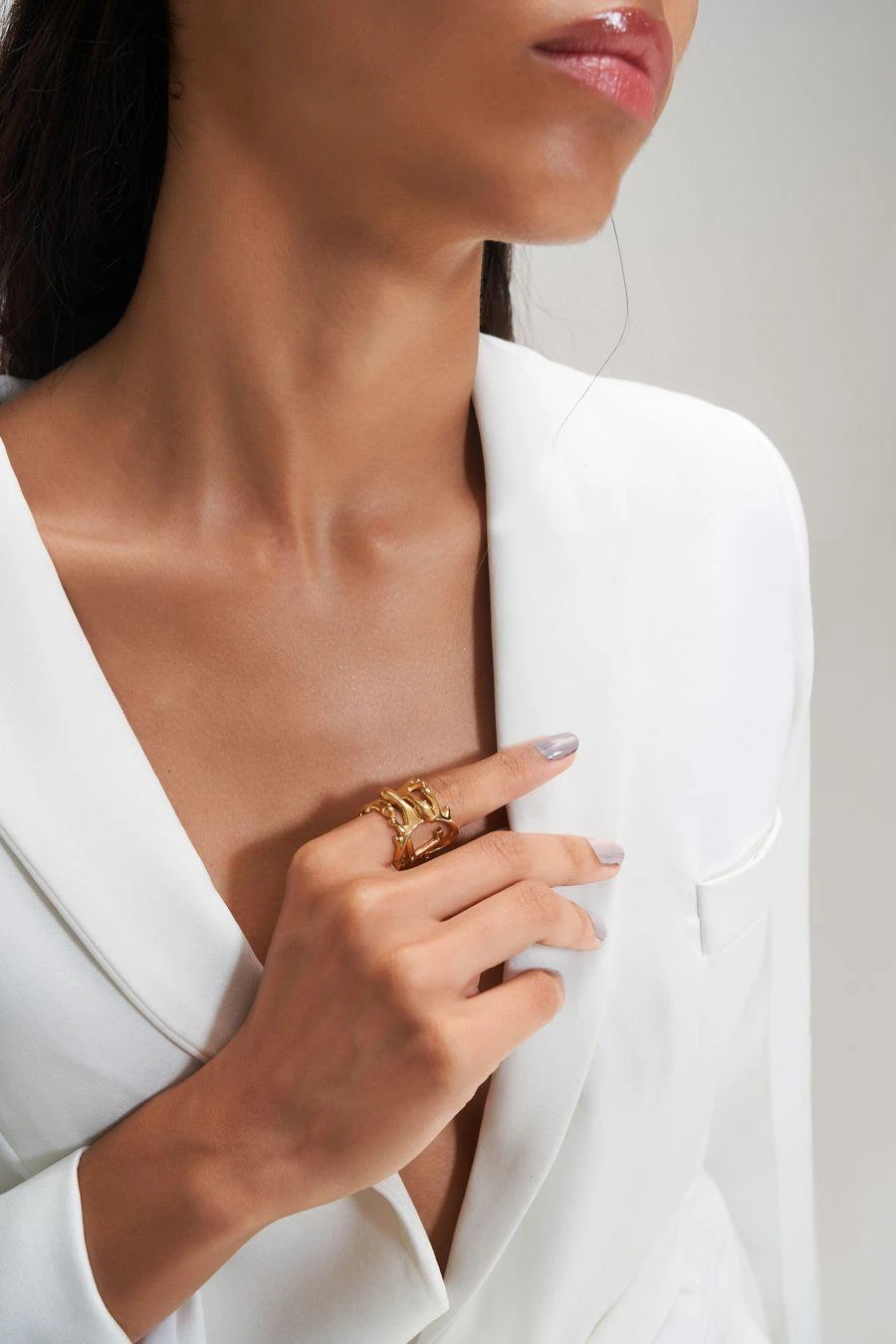 Carved to give a unique identity to your finger, this ring is inspired by a distinctive silhouette that is poetically engraved in the design of the creation. The ring is crafted in gold finish making it a must-have classic this season & beyond.