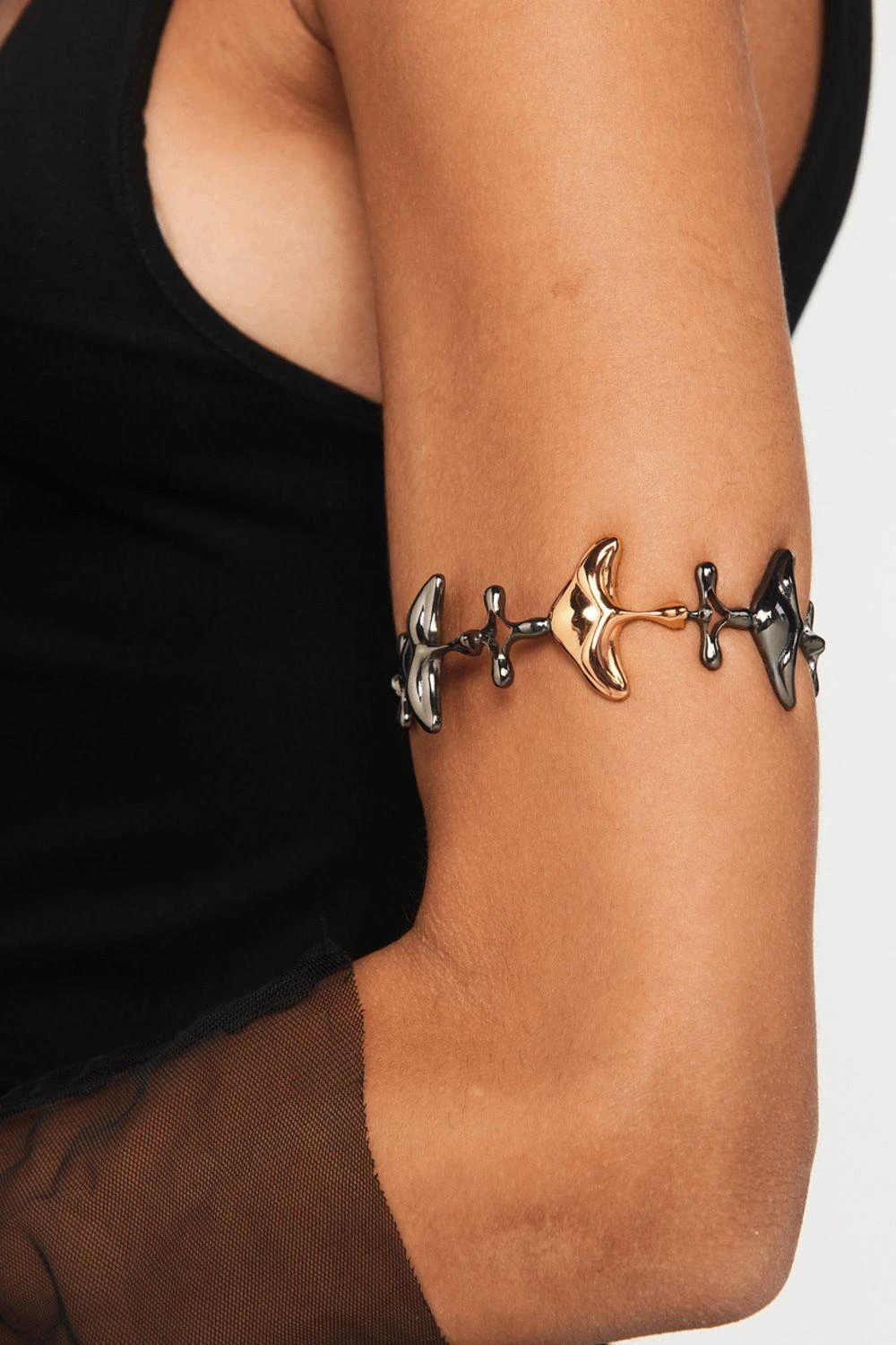This bangle in dual tone finish is a versatile piece created in 22 KT gunmetal plating, that will effortlessly take the centerstage in any outfit. The design is elevated with gold highlights that seamlessly blend with the design.