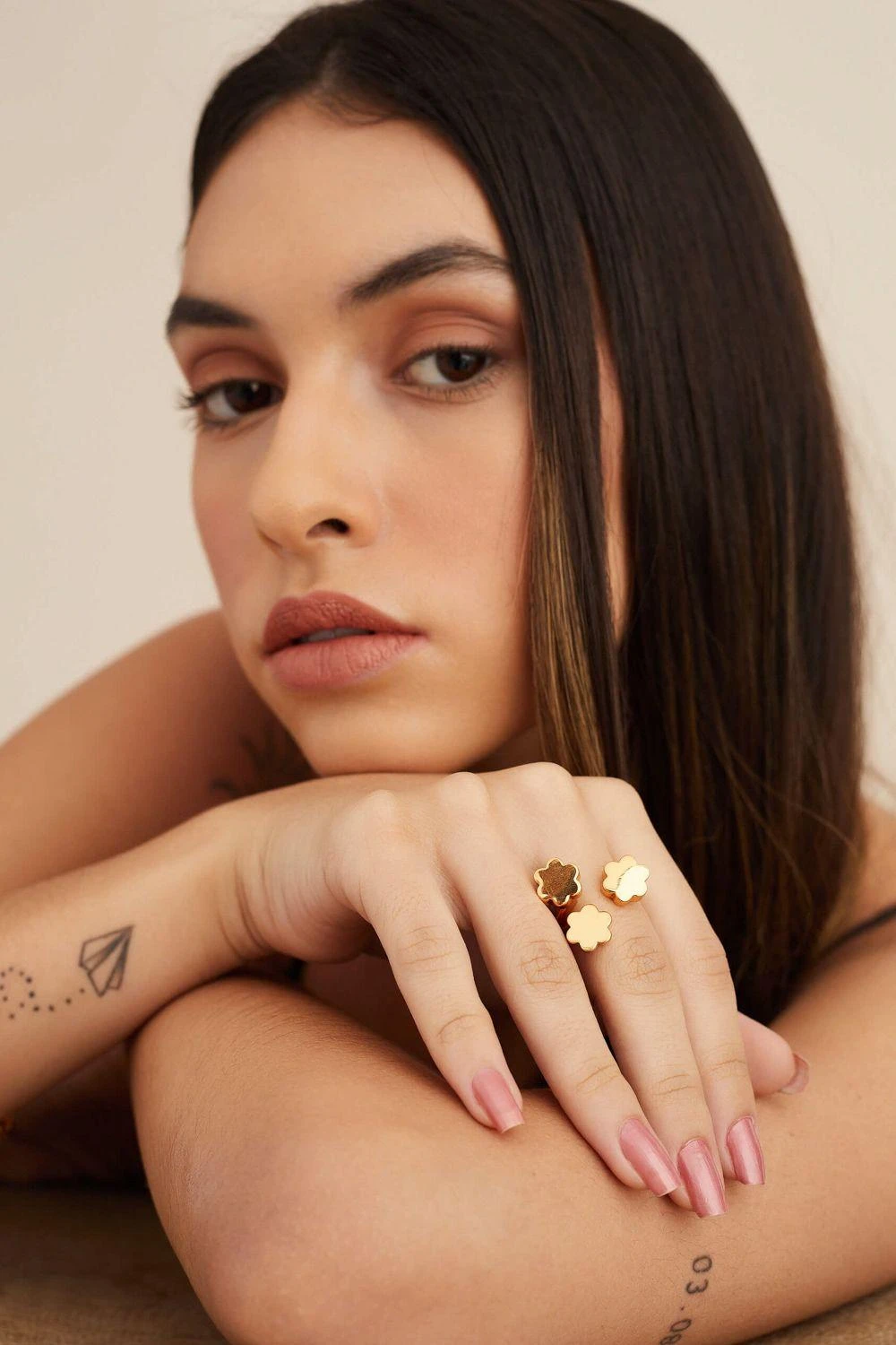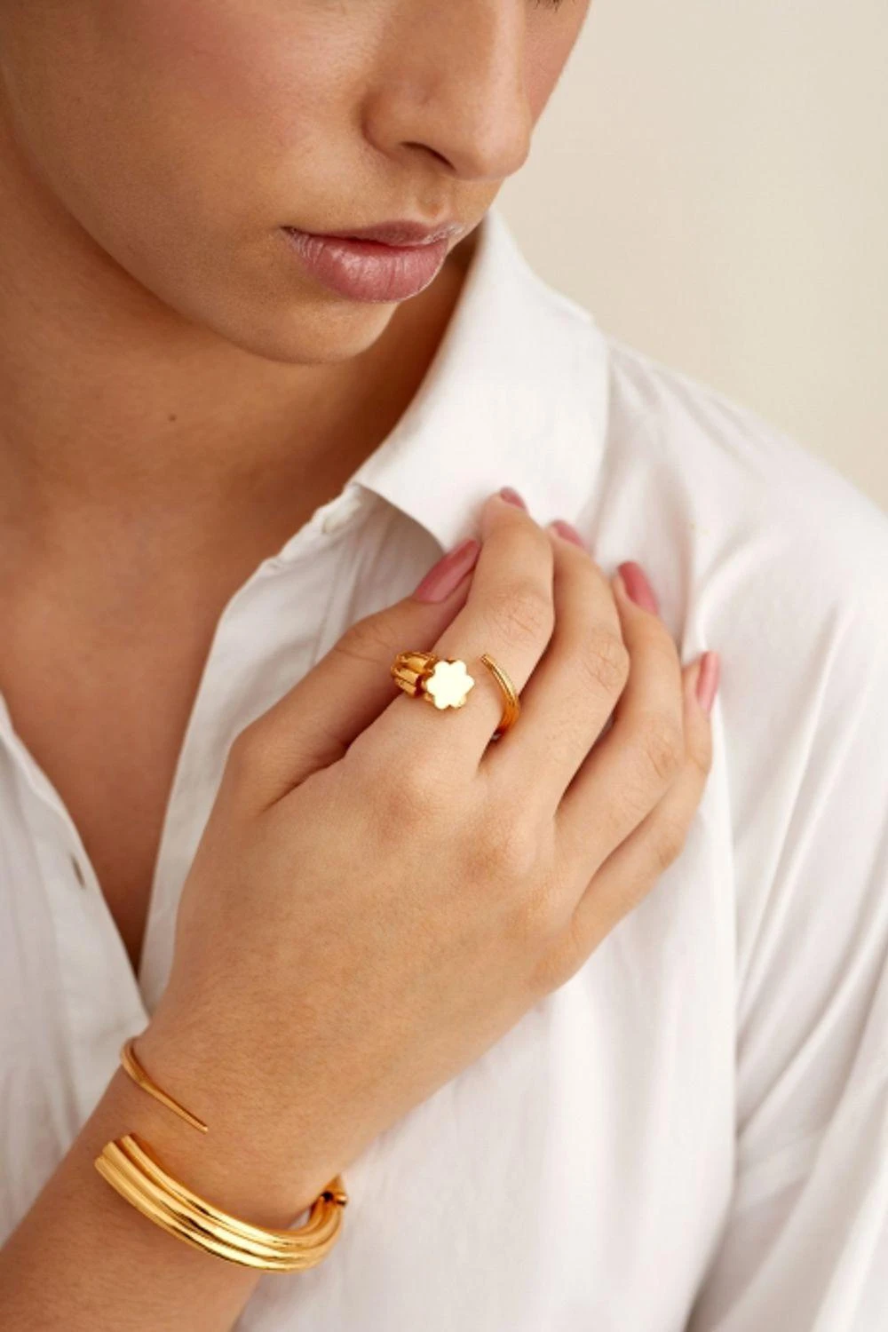 This OH poppi clump ring is reimagined in the abstract form of 5-petal monogram. The 22K gold finish shines bright in a meticulously crafted design that celebrates the power and beauty of the wearer.