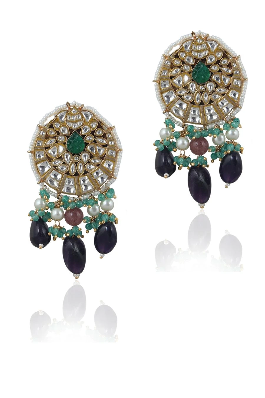 Accentuate your festive looks with this green necklace set. Crafted in a silver & copper mix, this set comes with a jadtar necklace with intricate beadwork paired with matching earrings. Style it with an anarkali or lehenga to complete the look.