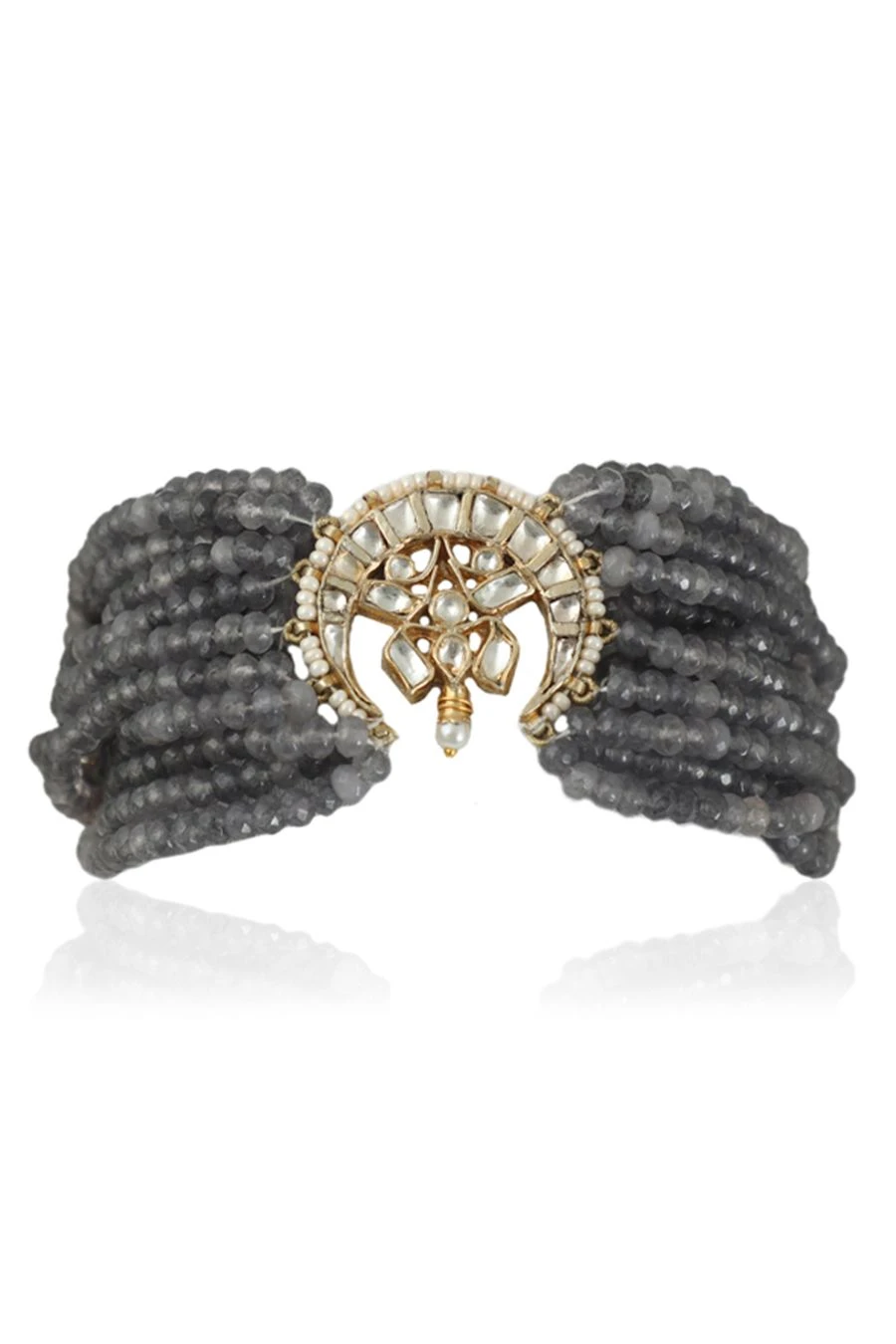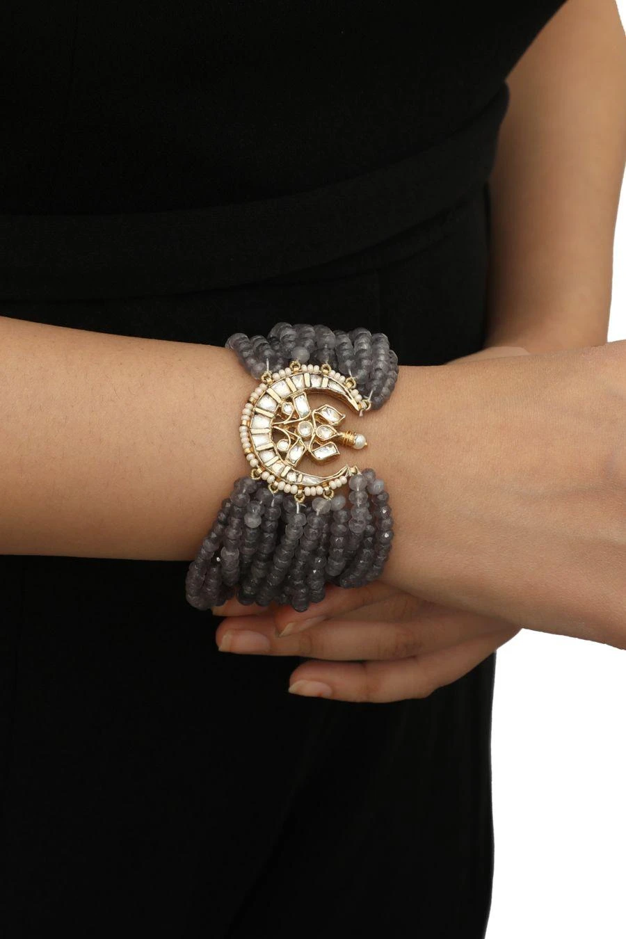 Accentuate your festive look with this grey bracelet. Crafted in a silver & copper mix, this moon shaped bracelet features a pearl line with intricate beadwork. Style it with an anarkali or lehenga set to complete the look.