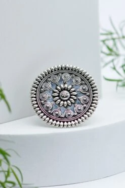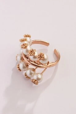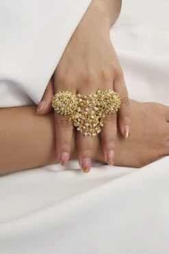 This Floral Jadau Ring in 22kt Gold Plating is a stunning work of art that showcases intricate floral patterns, encrusted with sparkling jadau stones and lustrous pearls, making it a true heirloom piece.