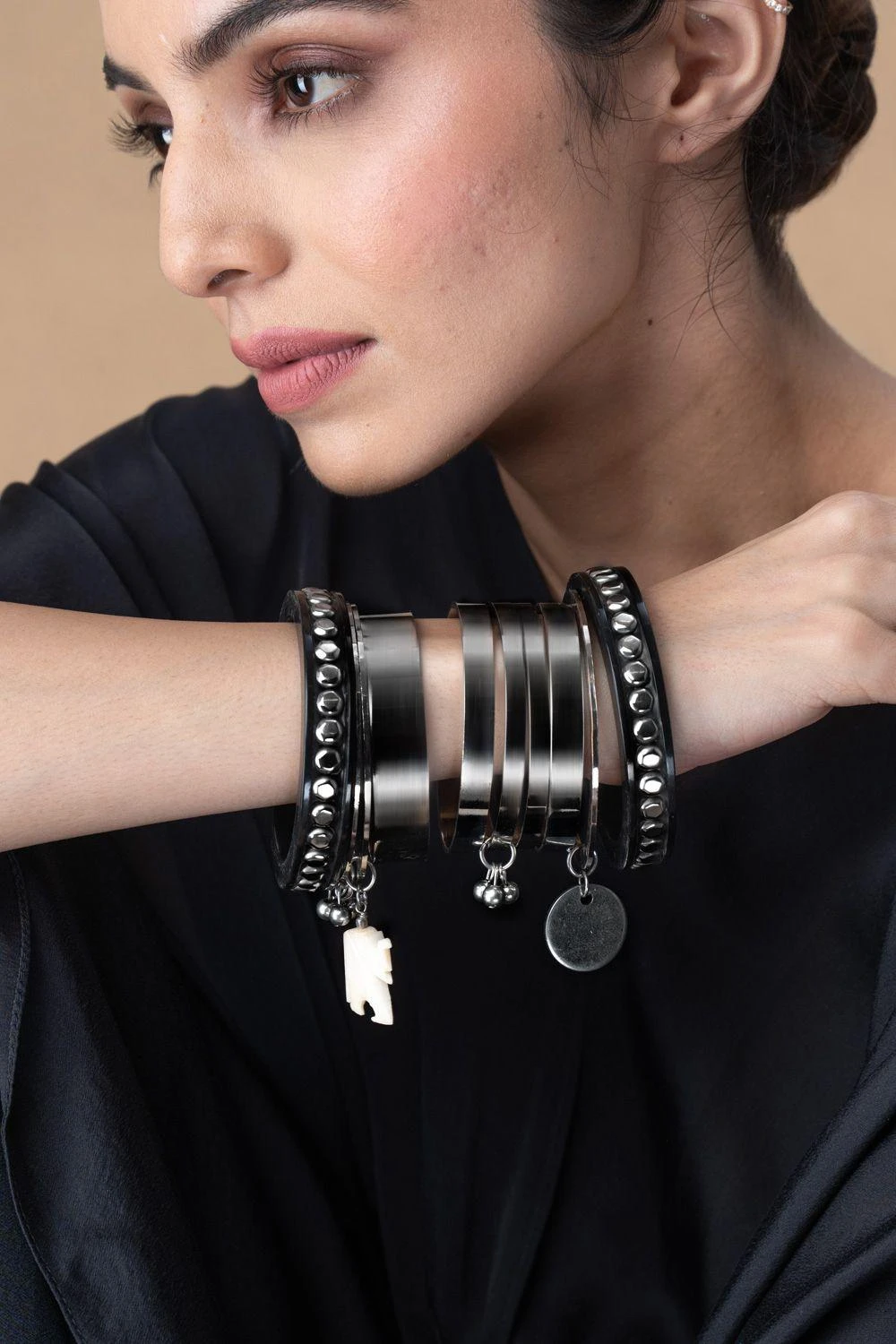 This statement golden & silver bangle stack is crafted in metal alloy and accented with quirky charms. This bangle stack can be paired with both Indian & contemporary looks.