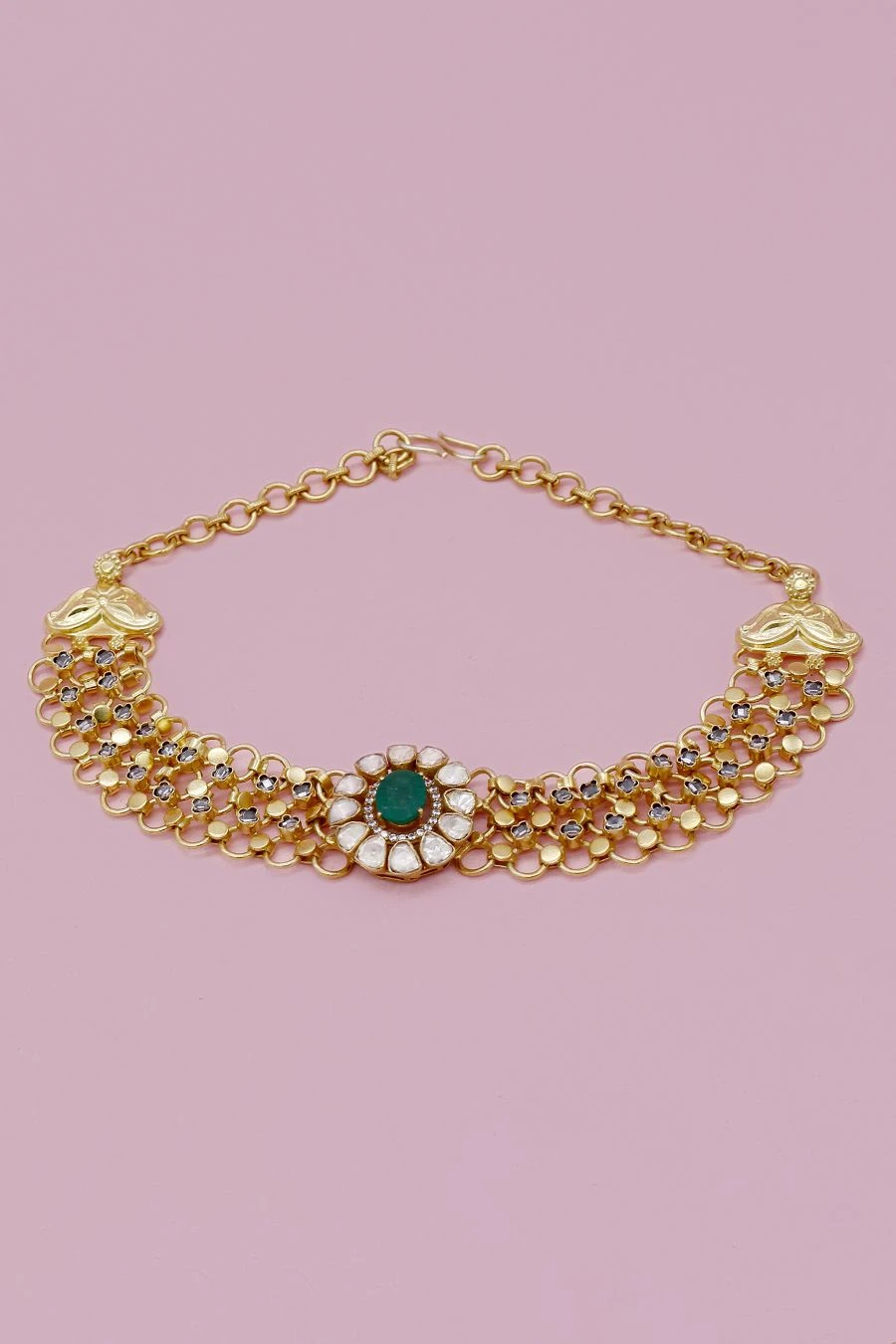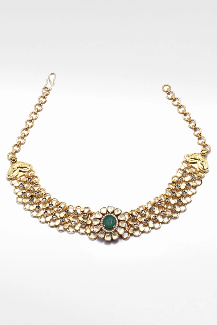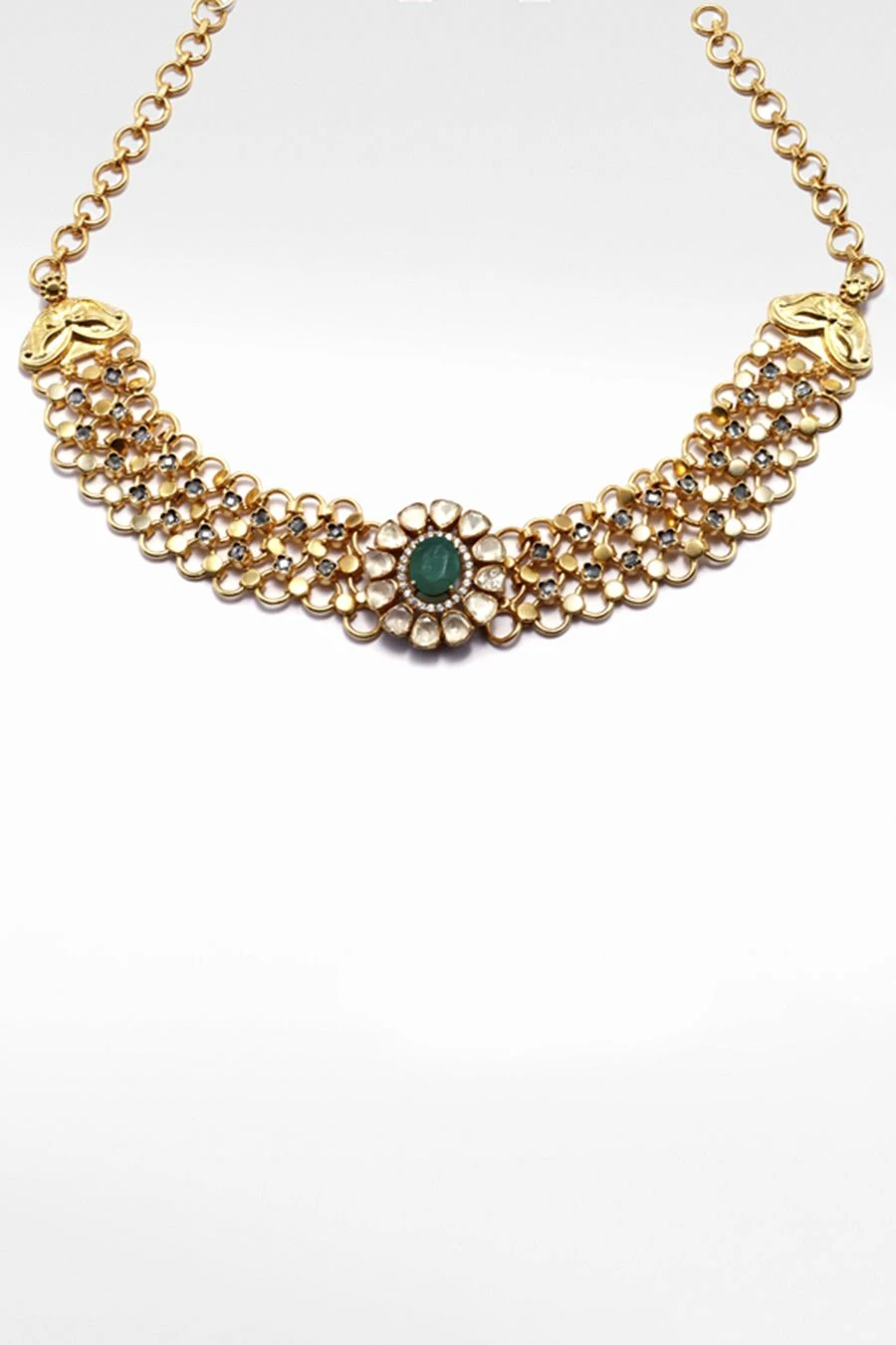 This chic handcrafted silver necklace is the perfect accessory to style with your daytime looks. This 24K gold-plated silver choker is studded with moissanite gemstones and green onyx.