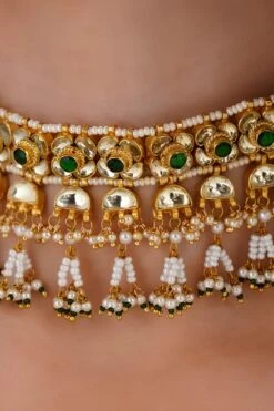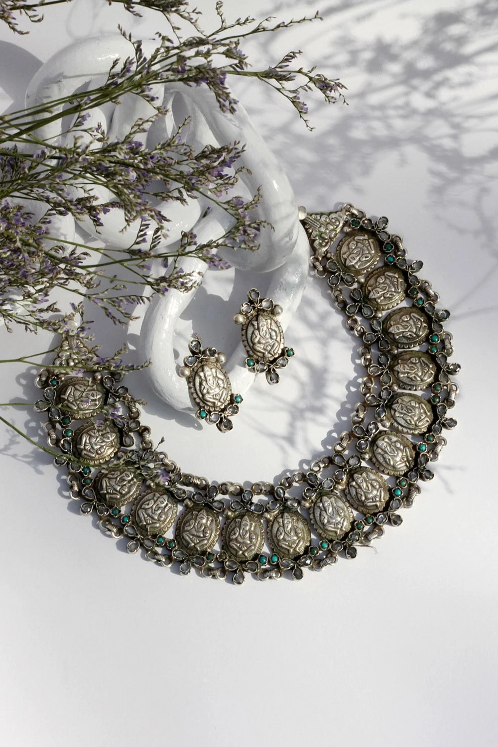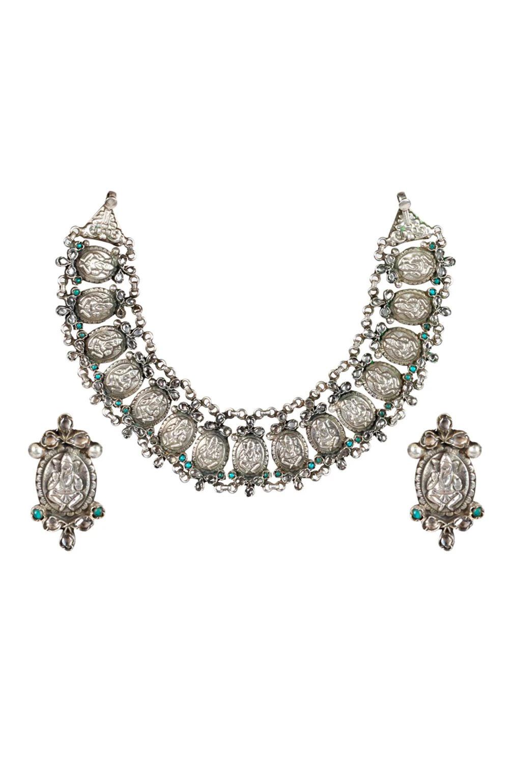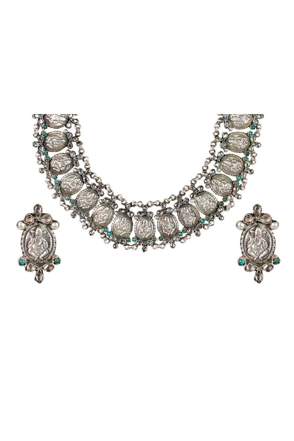 Elevate your ethnic looks with this ornate necklace & earrings handcrafted in silver and punctuated with CZ & semi precious turquoise stones. Style it with a handloom sari or kurta set for your festivities.