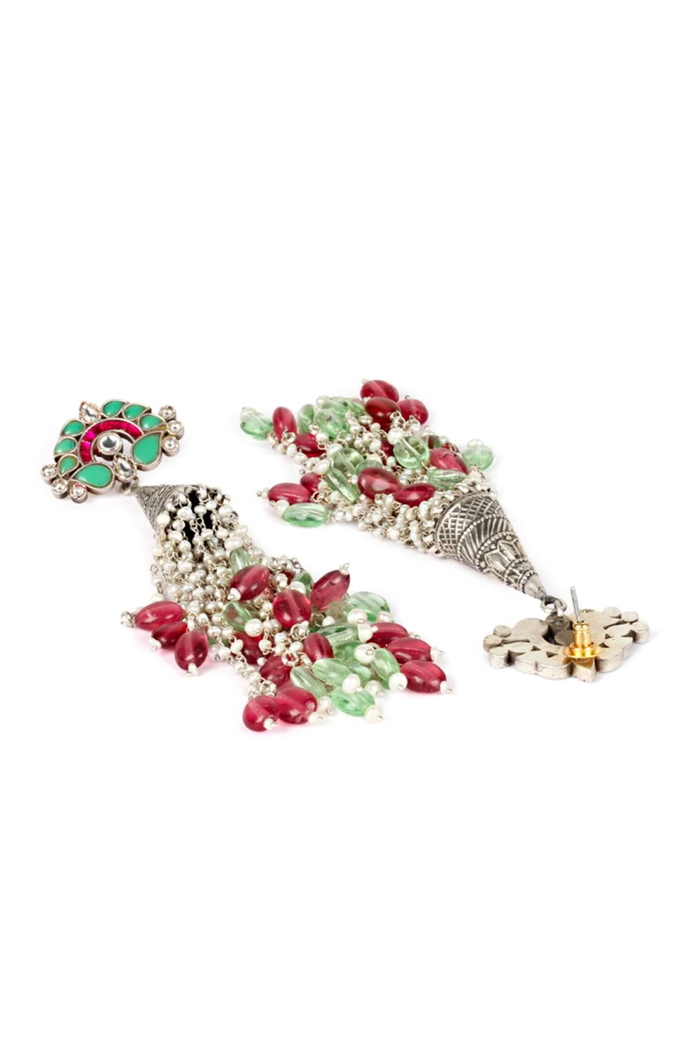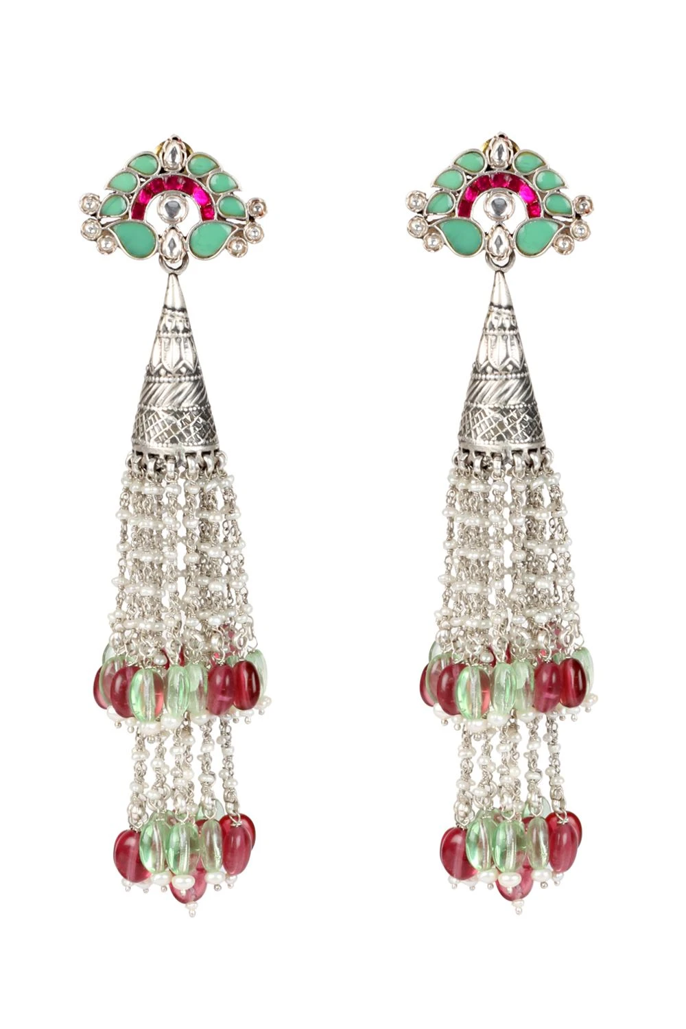 Add finesse to your festive looks with these silver danglers. Handcrafted in silver, these earrings are curated with kundan, pink & emerald semi precious stones. Style it with a kurta or kaftan set for an intimate festivity.