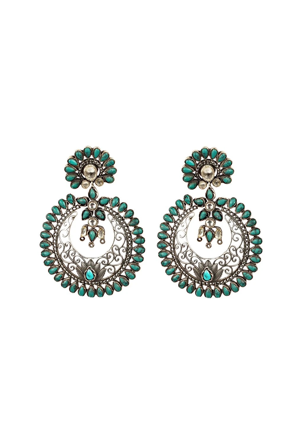 Elevate your ethnic looks with these statement chaandbaali earrings handcrafted in silver and encrusted with bright turquoise stones. You can add these with a crisp white tunic for a pop of colour.