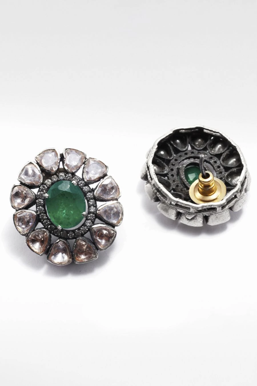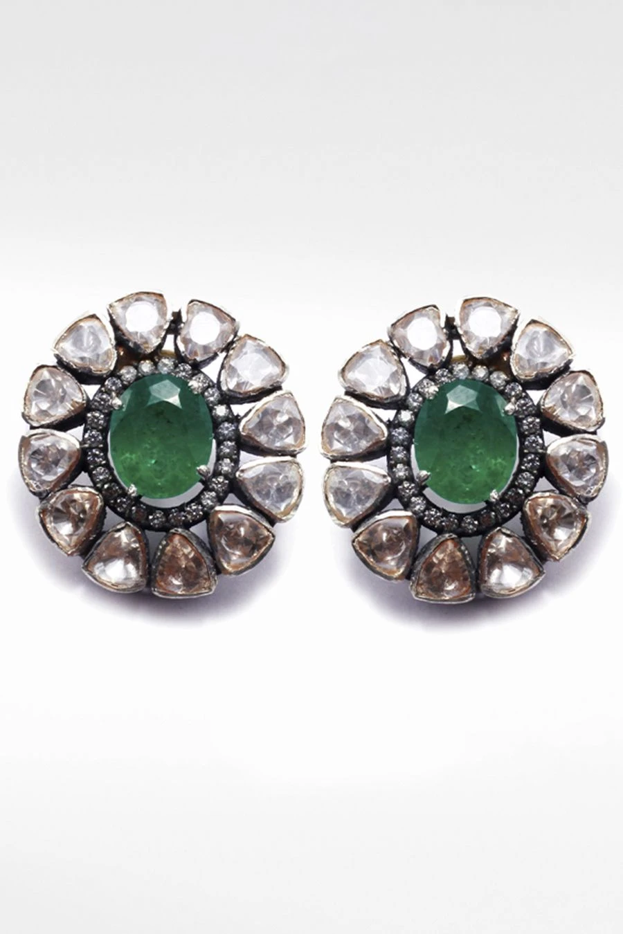 This chic handcrafted silver earring is the perfect accessory to style with your daytime looks. While demonstrating exceptional craftsmanship, these earrings are handcrafted with moissanite gemstones and green onyx.