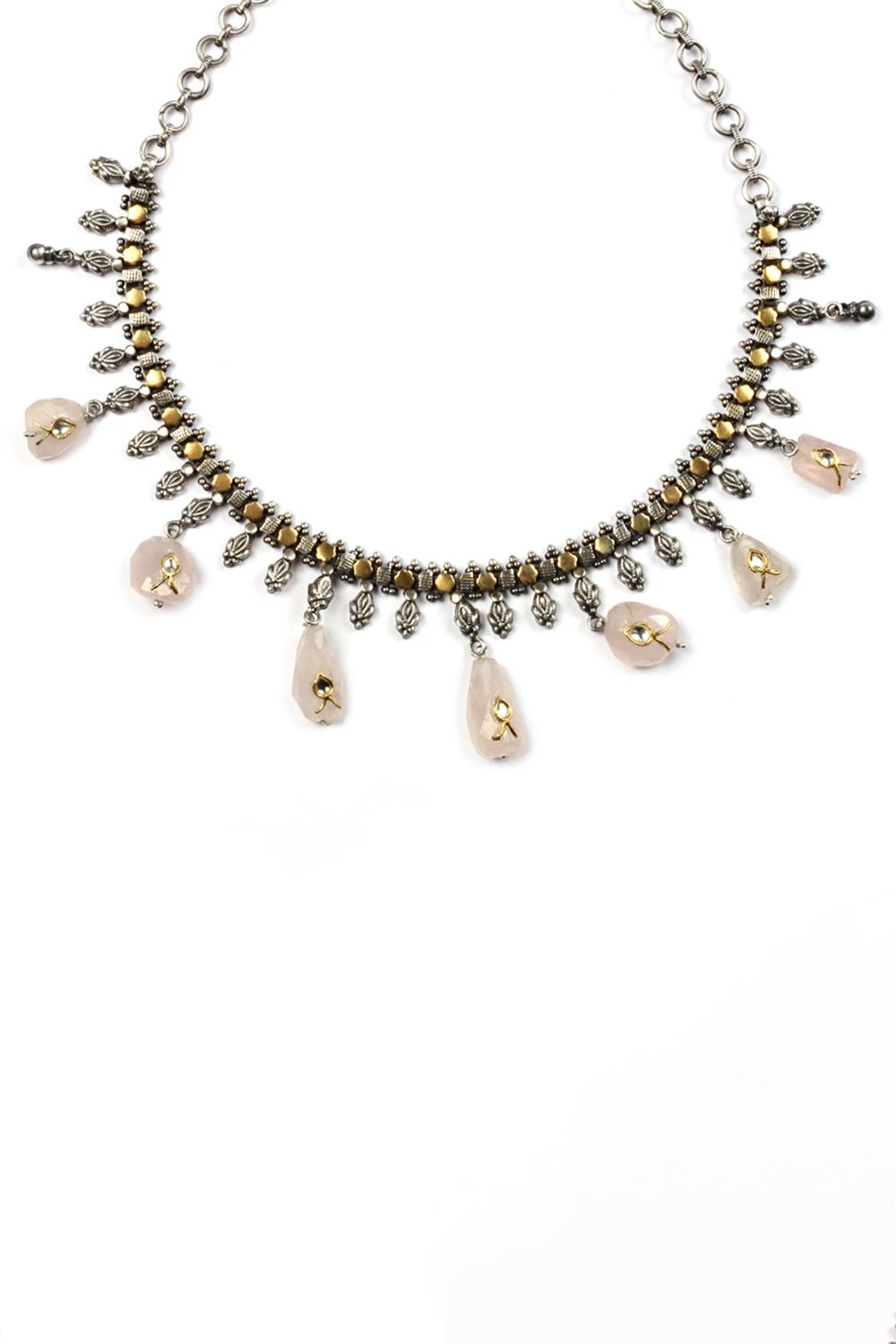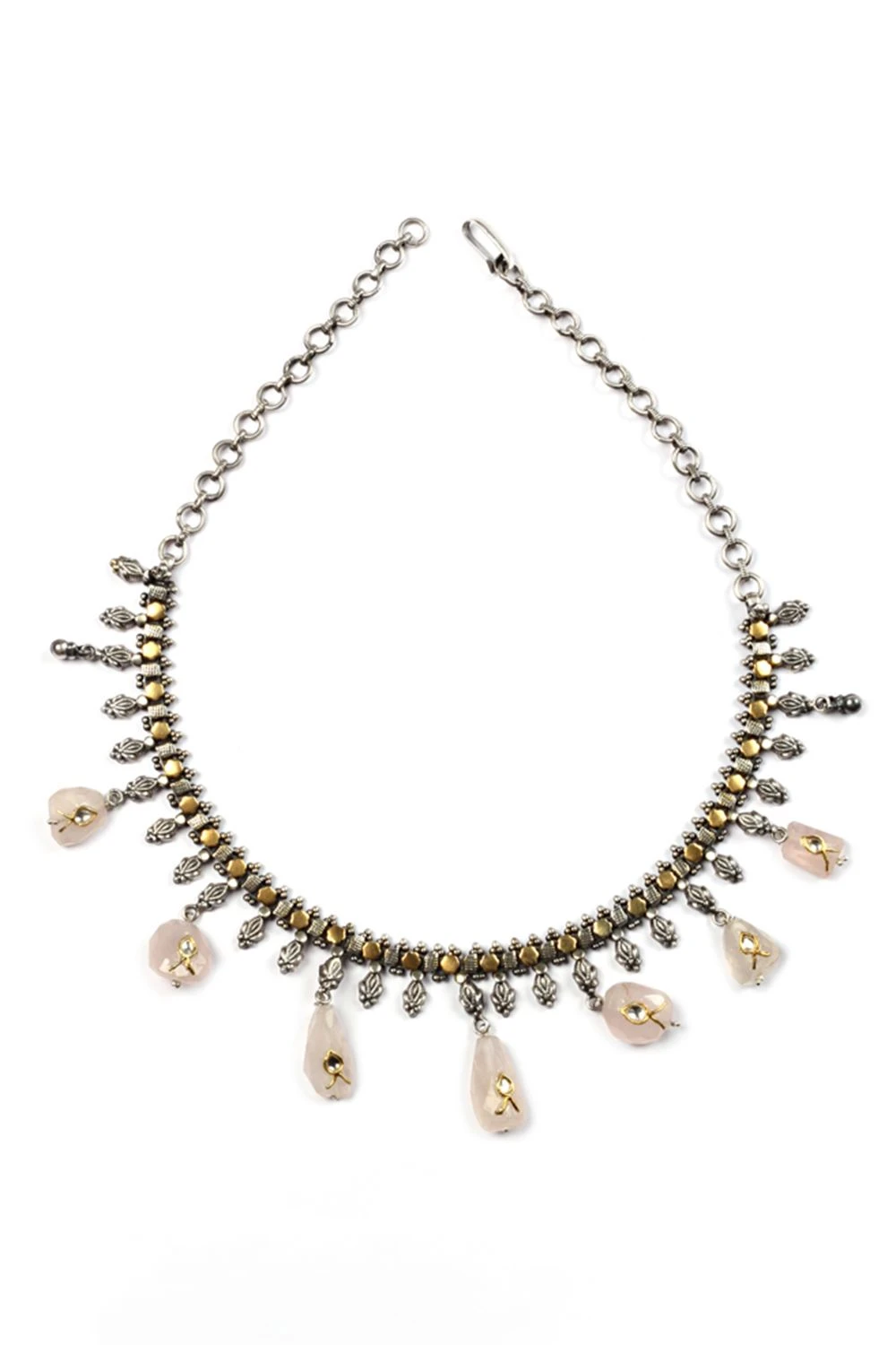 This round silver necklace features a haandcrafted intricate floral pattern. The rose pink semi precious stones add to the uniqueness of this design. Style this staatement piece with a floral sari and silver jhumkis.