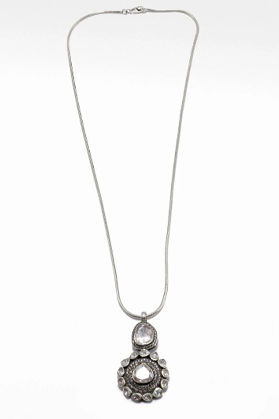 This chic handcrafted silver necklace is the perfect accessory to style with your daytime looks. While demonstrating exceptional craftsmanship, this silver necklace is studded with moissanite gemstones and comes with a long adjustable silver chain.