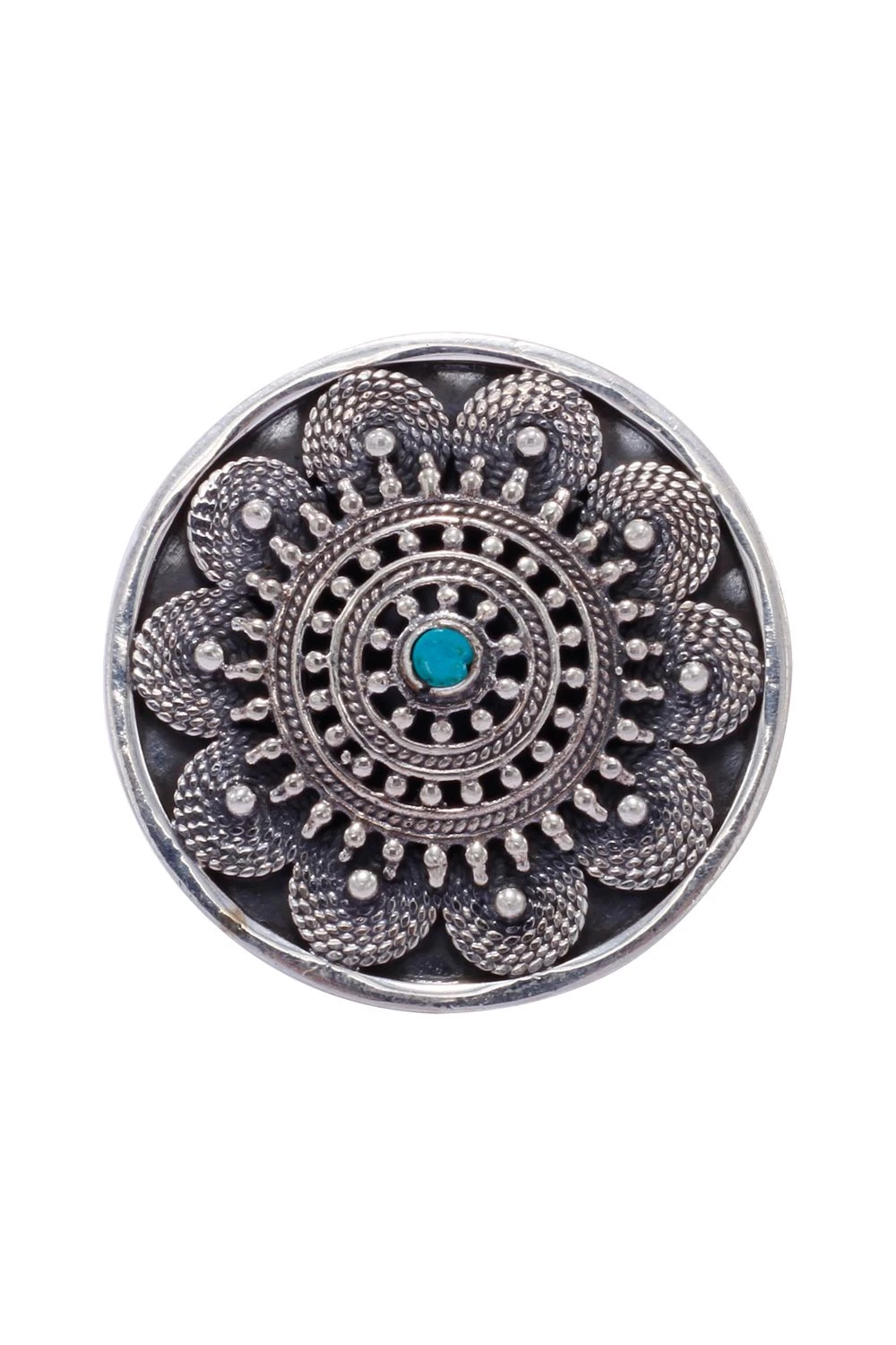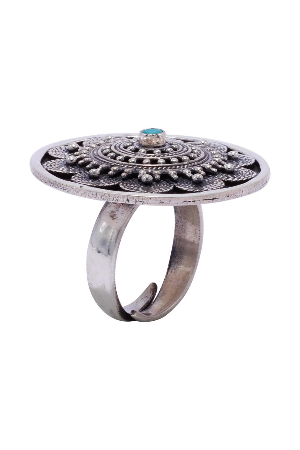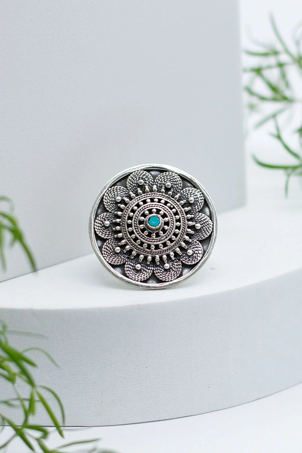 Adorn your fingers with this oxidized silver ring featuring a turquoise gemstone. Crafted in floral pattern, it exudes sophistication, adding a touch of exquisite beauty to your style.