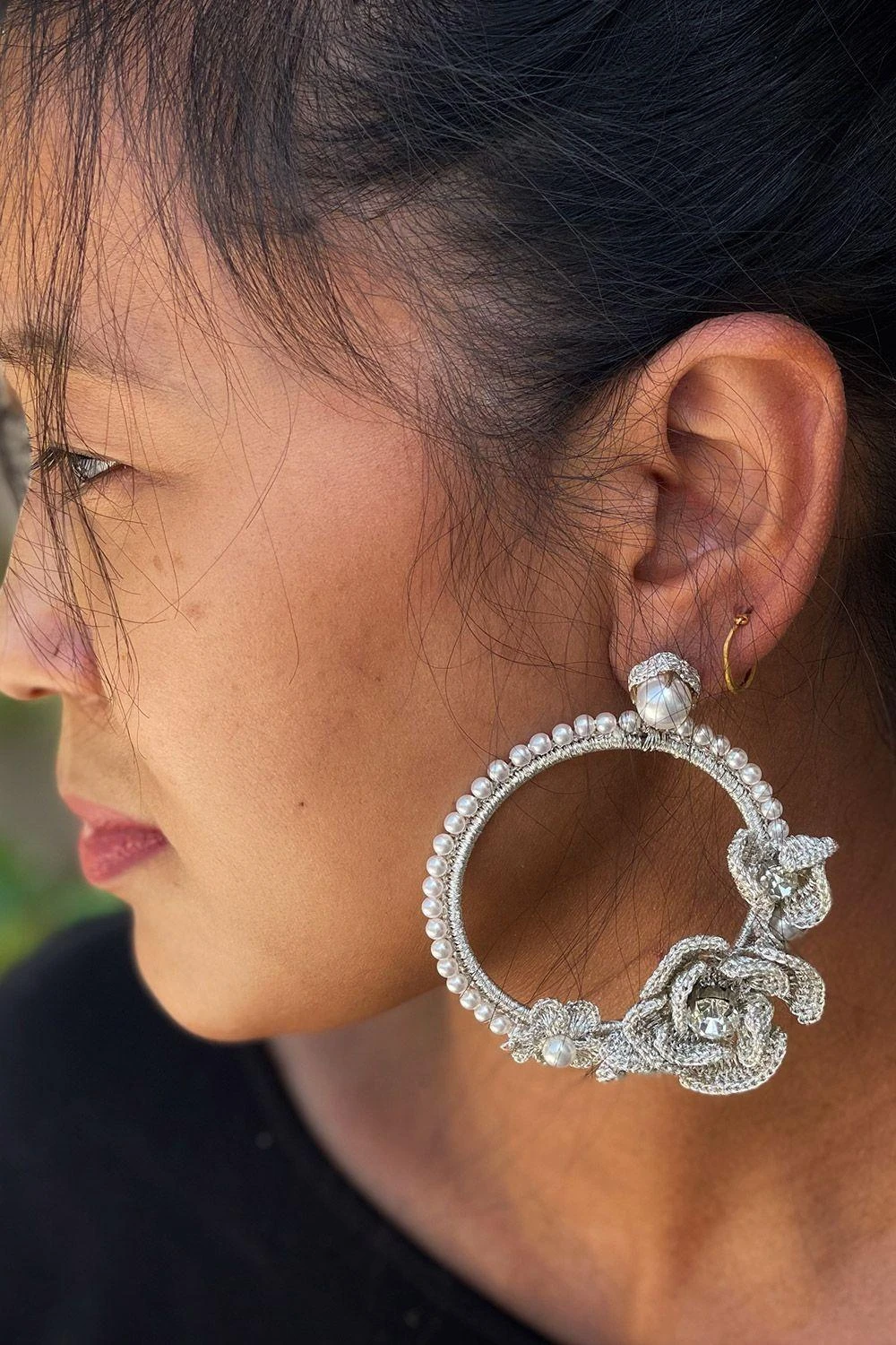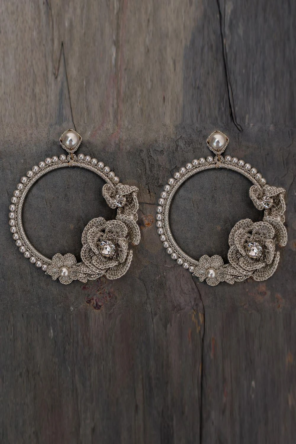 Add a classic charm with a hint of modern glamour to your traditional look with these hoop earrings. They feature an intricate pearl embellished crochet floral motif. Style these with Indian or contemporary looks with equal ease.