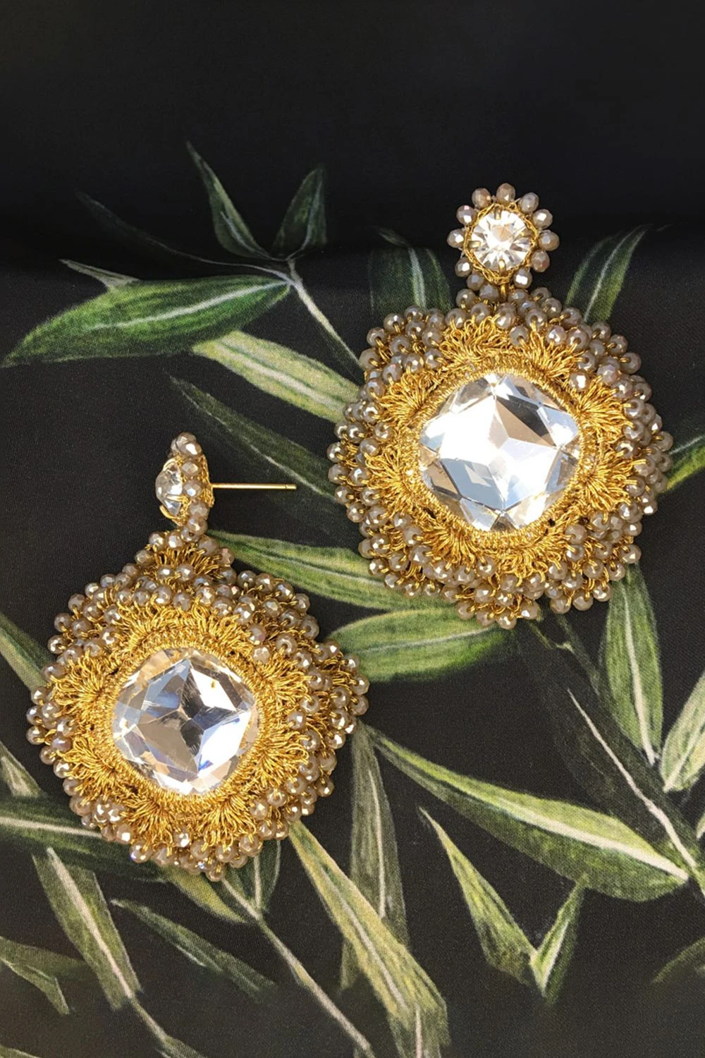 Indulge in the allure of these statement drop earrings. A large, captivating fancy stone takes center stage, encased in a meticulously crafted frame adorned with a delicate crochet edge of sparkling crystal beads.