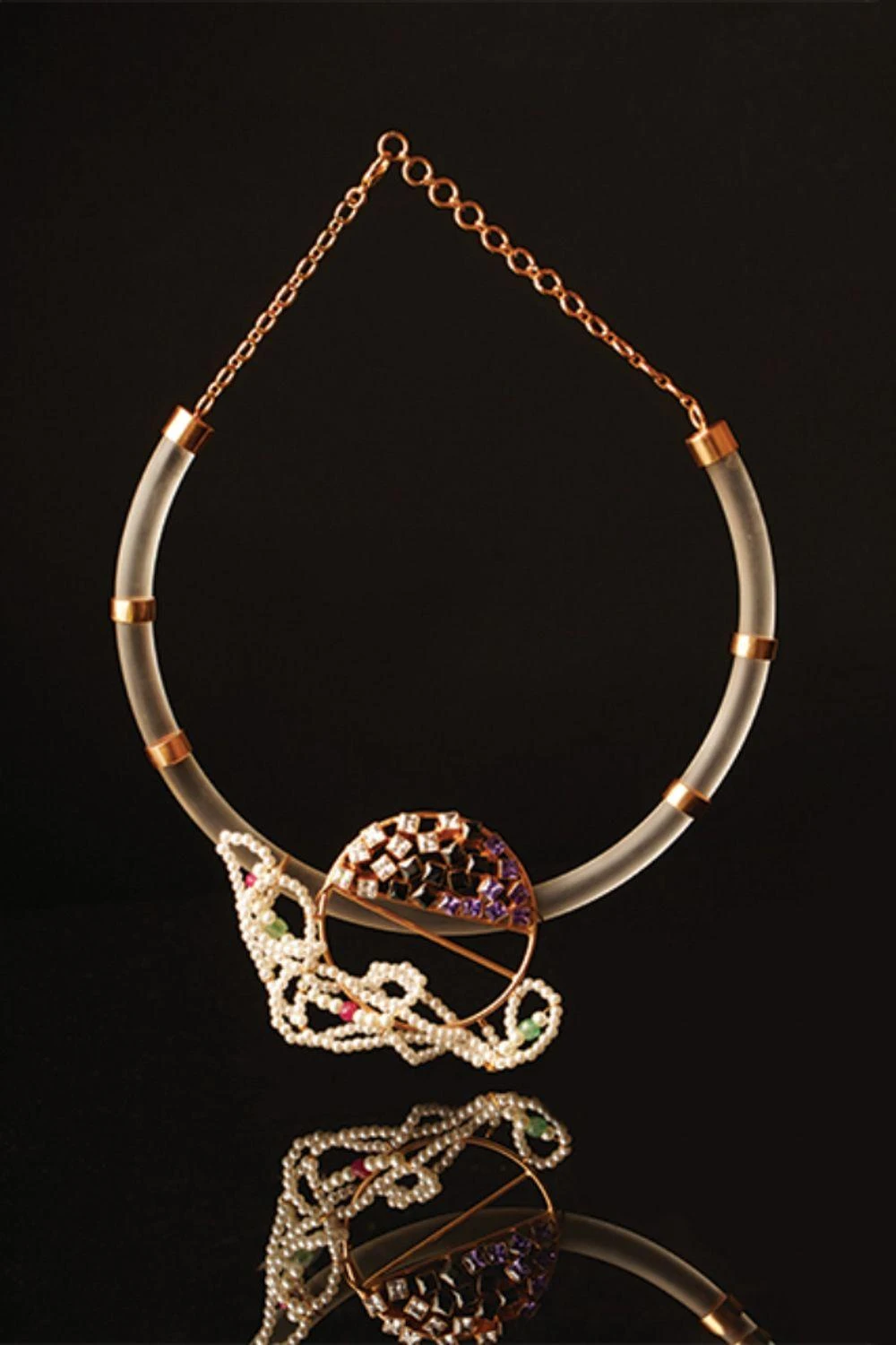 Adorn yourself with the celestial allure of a Kanthi necklace, bedecked in gold-plated ribbons, pearl streams & a celestial gemstone cluster of lavender, black & white cubic zirconia. Elevate your elegance with this ethereal masterpiece.