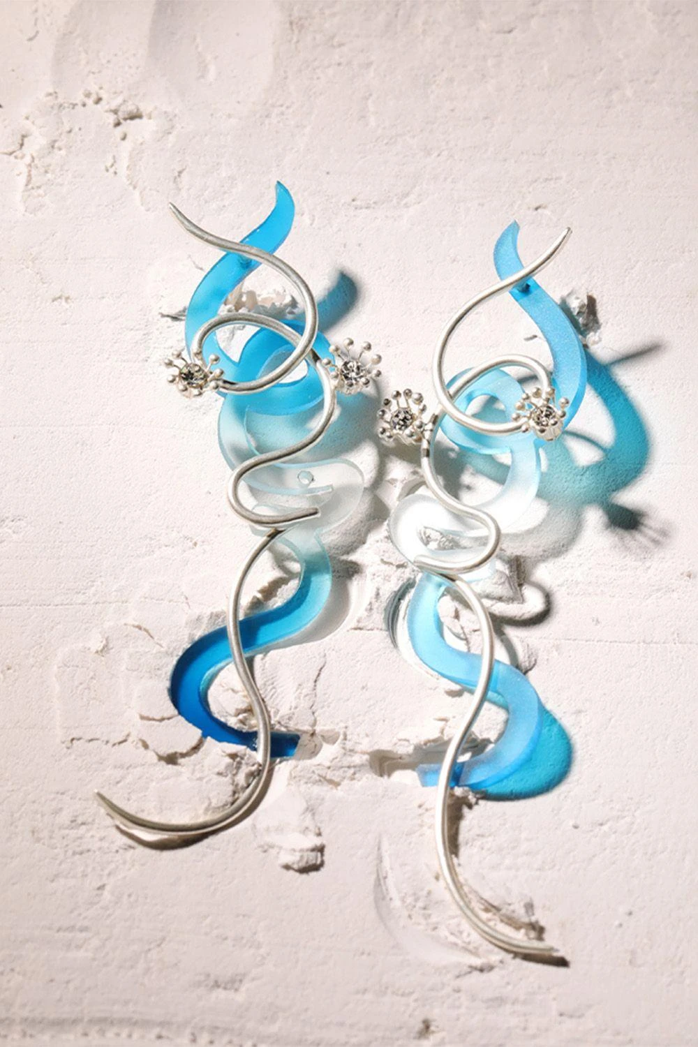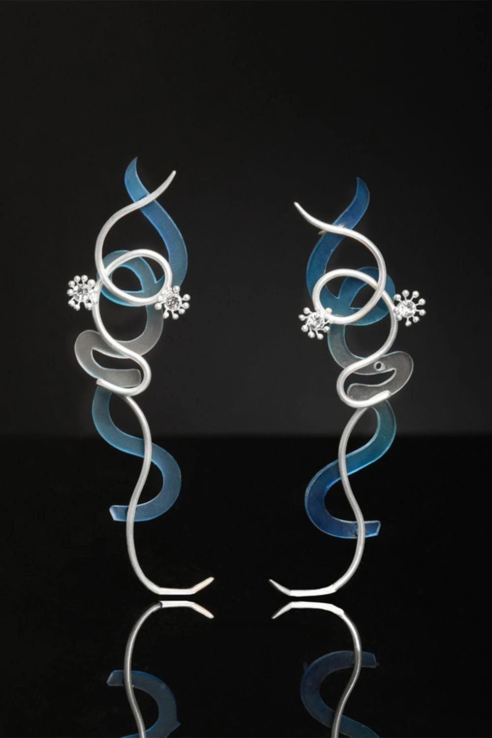 Modern yet understated, these silver-plated squiggly wire earrings can punctuate any look. These handcrafted blue earrings come with delicate floral embellishments. Pair them with a cocktail dress.