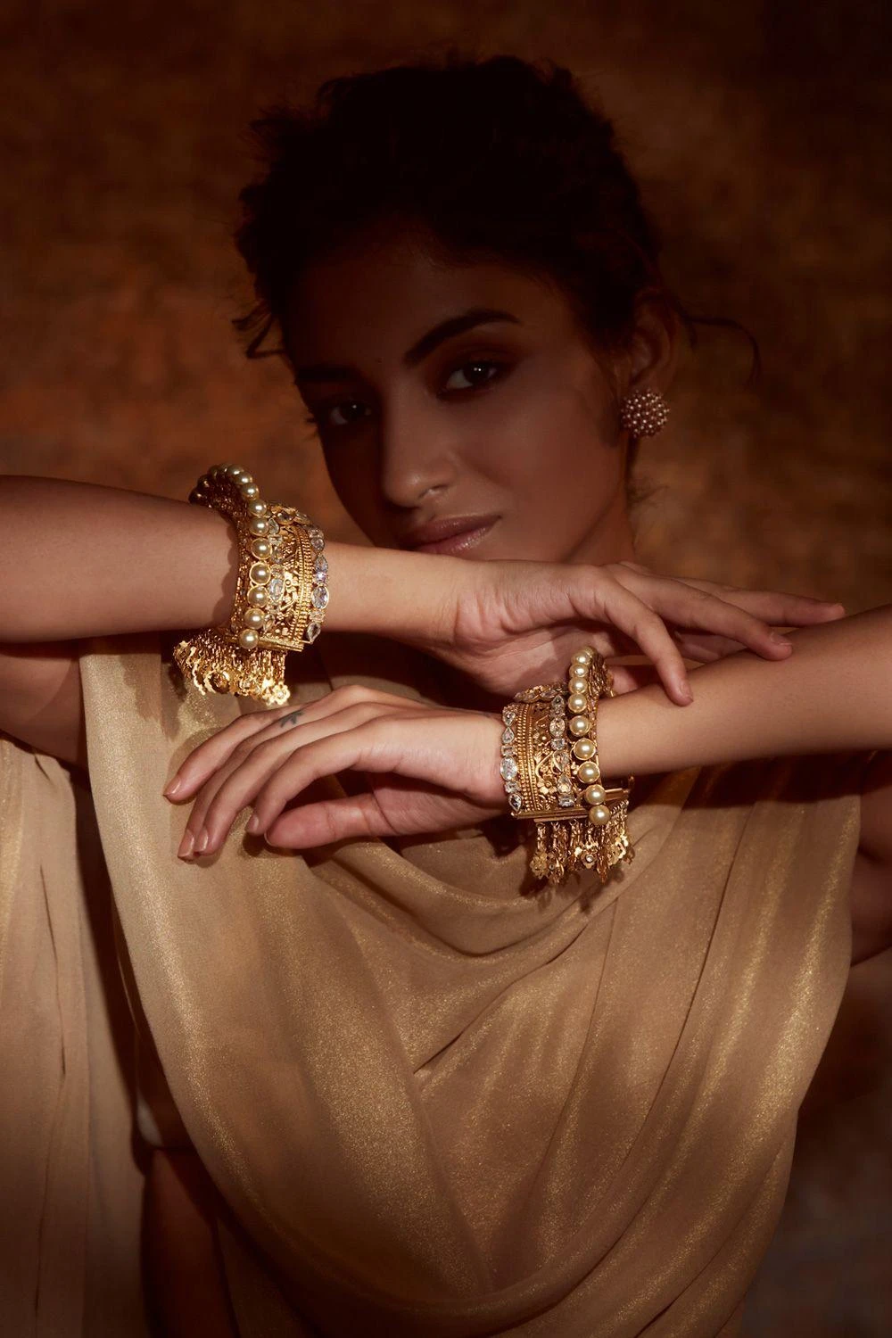 This ornate stack kada in 92.5 silver metal is finished with 24K gold-dipped polish. Handcrafted to perfection, it is embellished with hand-cut glass stones & 7 freshwater pearls. The design has fringe detail & comes with an openable lock mechanism.