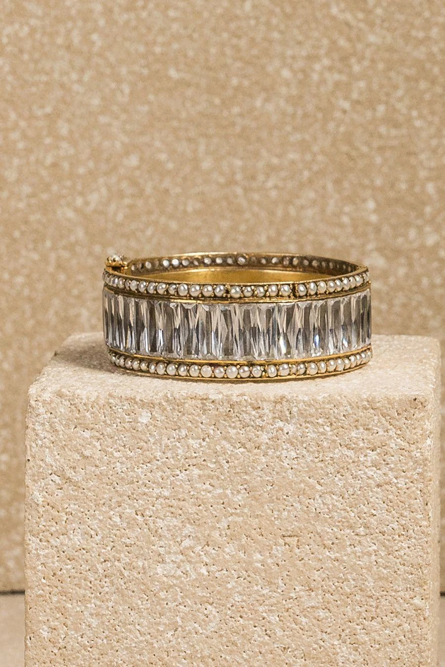 Handcrafted in 92.5 sterling silver & dipped in 24K gold polish this classic Baguette bangle is edged with fresh water pearls. It comes with an openable lock mechanism for easy wear and better fit.